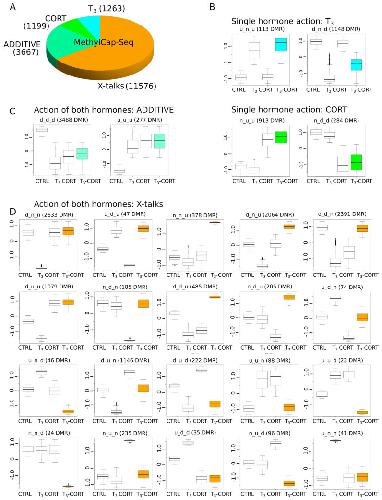 Figure 6. The complex dynamics of DNA methylation levels at DMRs. (A) Types of gene regulation by T3 and CORT. (B) Gene regulation by either T3 or CORT. (C) Gene regulation by T3 and CORT. (D) Complex regulation by both hormones (X-talks). |