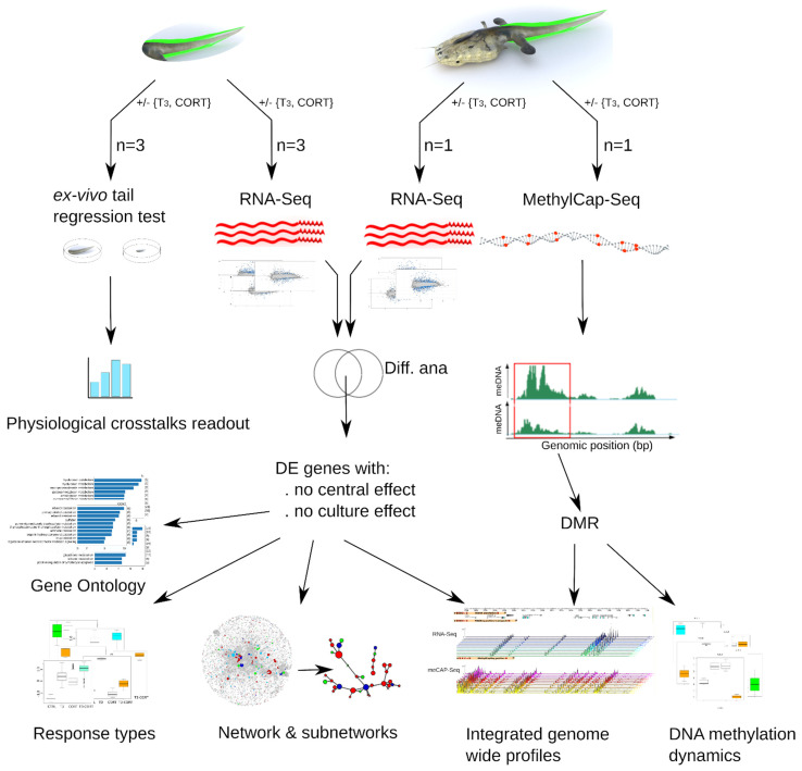 Figure 1. Experimental setup to address T3 and CORT cross-talks. An experimental and data analysis workflow. Tailfin (green) response to treatments was characterized by functional genomics. For each experiment, samples were collected from pools of five tailfins. |