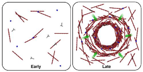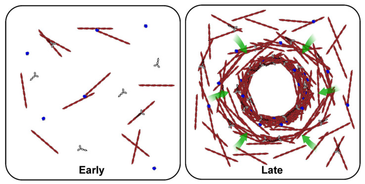 Figure 3. Gelation-contraction of the actomyosin network. Representative cartoon showing the distributions and rearrangements of F-actin (red), actin nucleators (blue), and myosin (gray) during early and late stages of actomyosin contraction in interphase X. laevis egg extracts. Shortly after F-actin nucleation (early stage; left panel), the F-actin network undergoes contraction (late stage; right panel), resulting in cytosolic flows towards the aggregate center (green arrows) and an F-actin density gradient. |