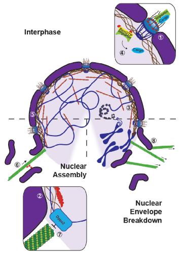 Figure 4. The cytoskeleton and nuclear assembly, structure, and breakdown. Overview schematics of the different contributions of the cytoskeleton to the formation and maintenance of the nucleus. Nuclear envelope is shown in purple, chromatin in blue, lamin filaments in brown, actin in red and microtubules in green. (1) Lamin B3 promotes the recruitment of the nucleoporin, Nup153, into nuclear pores and to the nuclear envelope. (2) The Lamina-associated protein LAP2 contributes to DNA-nuclear membrane interactions, and ultimately to the elongation of DNA during replication. (3) F-actin accumulates at the sub-nuclear membranous region to stiffen the nuclear lamina and maintain the binding of chromatin to the nuclear envelope. (4) Nuclear actin helps the release of cargoes from RanGTP-importins. (5) The actin-interacting protein, protein 4.1, relies on its spectrin-actin-binding domain (SABD) to interact with nuclear actin and contribute to the nuclear formation. (6) Minus-end directed motors transport membranous nuclear envelope precursors to assemble the nucleus. (7) The chromatin binding protein, Dppa2, inhibits microtubule polymerization near chromatin to allow for proper nuclear assembly. (8) Microtubules may serve a role in removing membranes during nuclear envelope breakdown. |