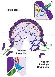 Figure 2. Microtubule-dependent self-organization of Xenopus laevis egg extract. Representative schematics of early and late stage organization of X. laevis egg extract during interphase. In the early stage (left panel), a microtubule aster (green) associated with the nucleus (purple) begins to expand and makes contact with dispersed elements of the cytosol including the ER (yellow), mitochondria (blue), and actin cytoskeleton (red). After reaching steady state (right panel) the microtubule cytoskeleton has centered itself in the region of interest, together with it the associated nucleus and ER. Clustering of mitochondria towards the âcellâ center through the activities of minus-end directed motors such as cytoplasmic dynein (gray) occurs concurrently with microtubule aster centering and continues until most membranous cargos are cleared from more distal regions. |