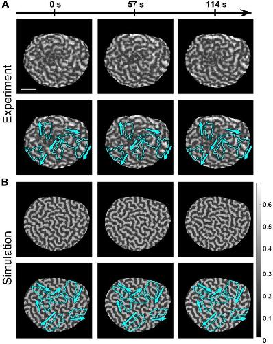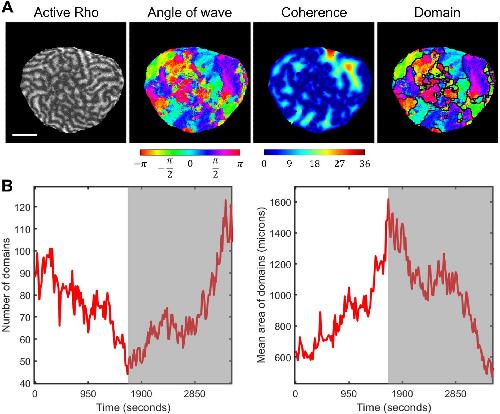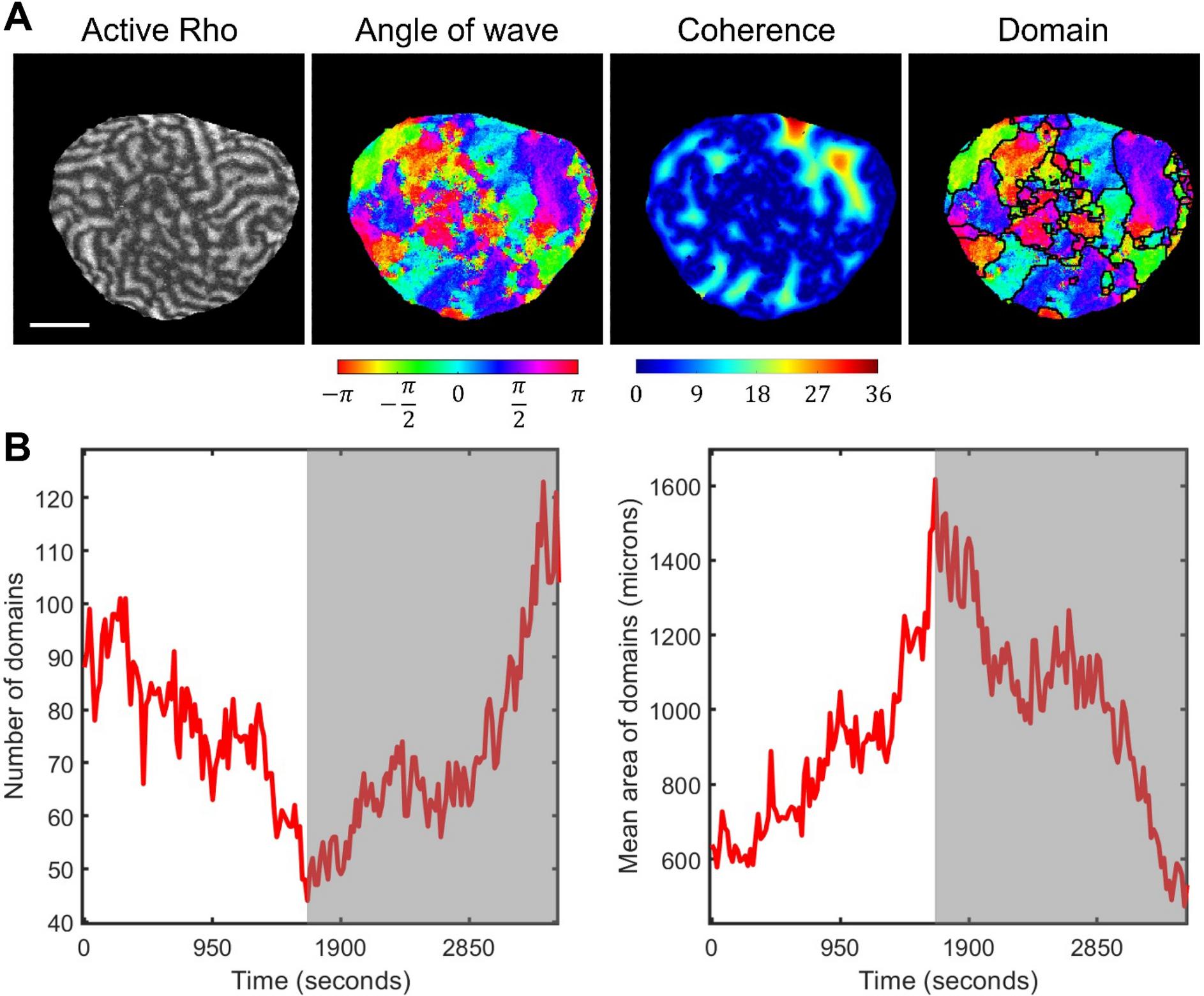 Spatiotemporal development of coexisting wave domains of Rho activity in the cell cortex.