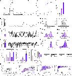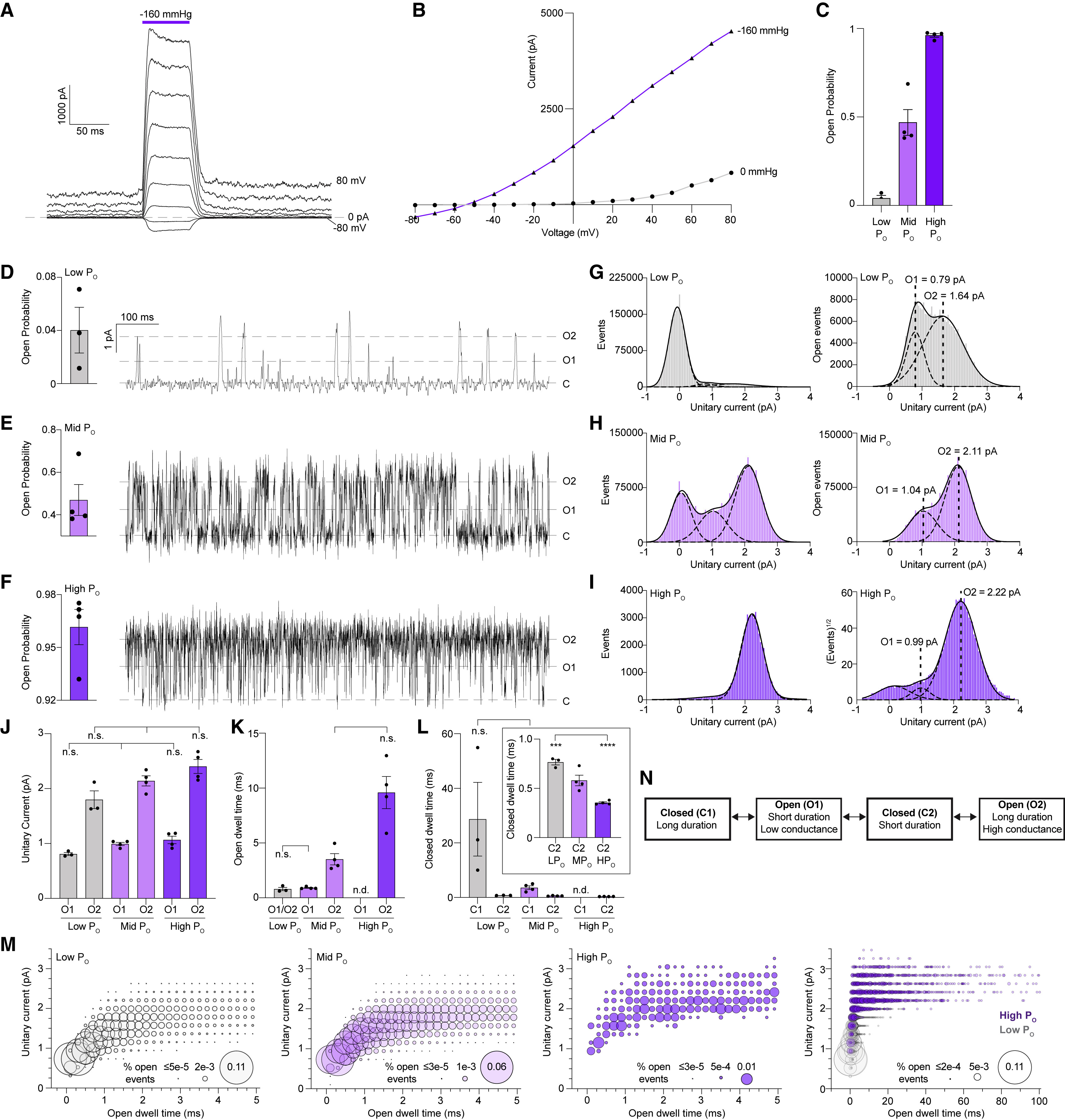 Figure 1. Distinct basal and mechanically activated open states in TRAAKWT (A) Macroscopic currents recorded across an inside-out patch pulled from a TRAAK-expressing cell in response to a voltage step protocol (Vhold = 0, Vtest = â80 to 80, ÎV = 10 mV, 20 mV intervals displayed) with a pressure step applied at each voltage (purple bar). (B) Current-voltage relationship from (A). (C) Open probability calculated from single-channel records (0.04 ± 0.02, 0.47 ± 0.07, and 0.96 ± 0.01 for low PO, mid PO, and high PO, respectively [mean ± SEM, n = 3, 4, and 4 patches]). All single-channel data in the paper were recorded at Vhold = 0 mV in a 10-fold gradient of [K+] and are presented in physiological convention. (DâF) 1 s portion from representative (D) low PO, (E) mid PO, and (F) high PO recordings, respectively. (GâI) All event (left) and open-only or square root all event (right) current histograms from representative (G) low PO, (H) mid PO, and (I) high PO recordings, respectively. (J) Unitary currents of O1 and O2 states (0.81 ± 0.03 pA and 1.80 ± 0.16 pA, 0.99 ± 0.03 pA and 2.14 ± 0.09 pA, and 1.07 ± 0.07 pA and 2.41 ± 0.13 pA for low PO, mid PO, and high PO recordings, respectively). (K) Open dwell time of O1 and O2 states (0.80 ± 0.15 ms, 0.91 ± 0.05 ms and 3.52 ± 0.51 ms, and 9.60 ± 1.46 ms for low PO, mid PO, and high PO recordings, respectively). (L) Closed dwell times of C1 and C2 states (28.70 ± 13.50 and 0.77 ± 0.03 ms, 3.59 ± 0.67 and 0.58 ± 0.05 ms, and 0.35 ± 0.01 ms for low PO, mid PO, and high PO recordings, respectively). For (J)â(L), data are mean ± SEM, n = 3, 4, and 4 patches; n.d., not determined; n.s., not significant; âââp = 0.0006, ââââp < 0.0001 (one-way ANOVA with Tukey correction). (M) Unitary current-open dwell time relationships for low PO, mid PO, and high PO open events and an overlay of low PO and high PO relationships at expanded timescale. Bubble size is proportional to percentage of open events. (N) Four-state TRAAK gating model. See also Figures S1âS5 and Table S1. |
