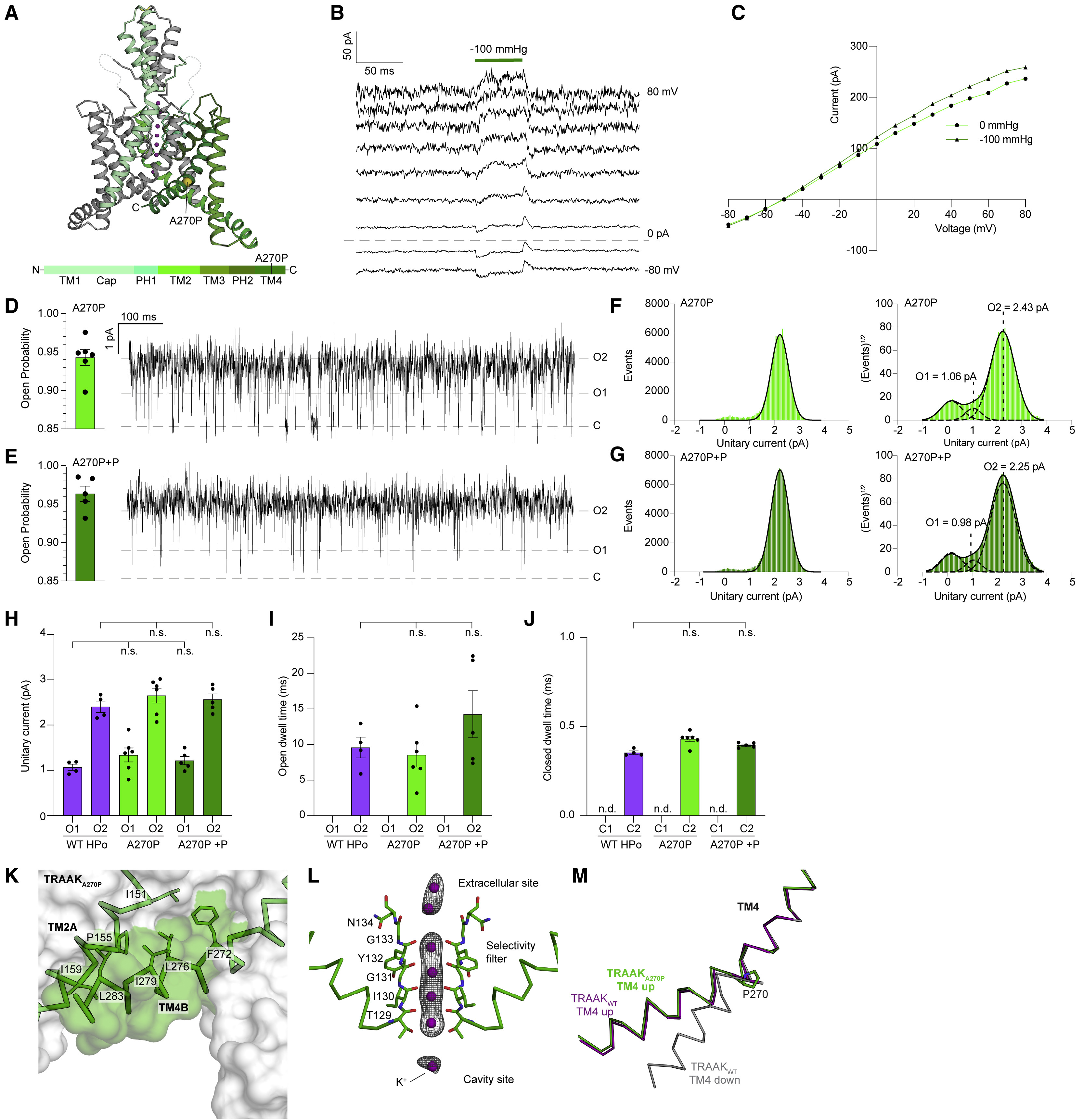 Figure 3. The FHEIG mutation TRAAKA270P promotes a long-duration, high-conductance TM4-up open state (A) Crystal structure of TRAAKA270P. Side view from the membrane plane with one protomer gray and the second protomer colored according to the key below. A270P is shown as a yellow sphere, and K+ ions are colored purple. (B) Macroscopic currents from a TRAAKA270P-containing patch in response to a voltage step protocol (Vhold = 0, Vtest = −80 to 80, ΔV = 10 mV, 20 mV intervals displayed) with a pressure step applied at each voltage (dark green bar). (C) Current-voltage relationship from (B). (D and E) Open probability calculated from all (D) TRAAKA270P and (E) TRAAKA270P with pressure (+P) records (left, PO = 0.94 ± 0.01 and PO = 0.96 ± 0.01 [mean ± SEM, n = 6 and 5 patches]) and 1 s portion from representative recordings. (F and G) All event (left) and square root all event (right) current histograms from representative (F) TRAAKA270P and (G) TRAAKA270P+P recordings. (H) Unitary currents of TRAAKWT HPO, TRAAKA270P, and TRAAKA270P+P O1 and O2 states (1.07 ± 0.07 and 2.41 ± 0.13 pA, 1.34 ± 0.15 and 2.65 ± 0.16 pA, and 1.21 ± 0.09 and 2.57 ± 0.12 pA, respectively). (I) Open dwell times of TRAAKWT HPO, TRAAKA270P, and TRAAKA270P+P O2 states (9.60 ± 1.46 ms, 8.56 ± 1.69 ms, and 14.47 ± 3.30 ms, respectively). (J) Closed dwell times of TRAAKWT HPO, TRAAKA270P, and TRAAKA270P+P C2 (0.35 ± 0.01 ms, 0.43 ± 0.01 ms, and 0.39 ± 0.01 ms, respectively). For (H)–(J), data are mean ± SEM, n = 4, 6, and 5 patches; n.d., not determined; n.s., not significant (one-way ANOVA with Dunnett correction). (K) View of the membrane-facing cytoplasmic half of TM4 in TRAAKA270P. A TM4-up conformation seals the membrane opening. (L) Ions in the TRAAKA270P-K+ structure. Polder omit Fo-Fc density (gray) around K+ ions (purple) displayed at 5 and 5.5 σ for extracellular and selectivity filter and cavity ions, respectively. (M) Overlay of TM4 from TRAAKA270P and TRAAKWT structures. A270P kinks TM4 to promote a TM4-up open state. See also Figures S1–S7 and Tables S1 and S2. |