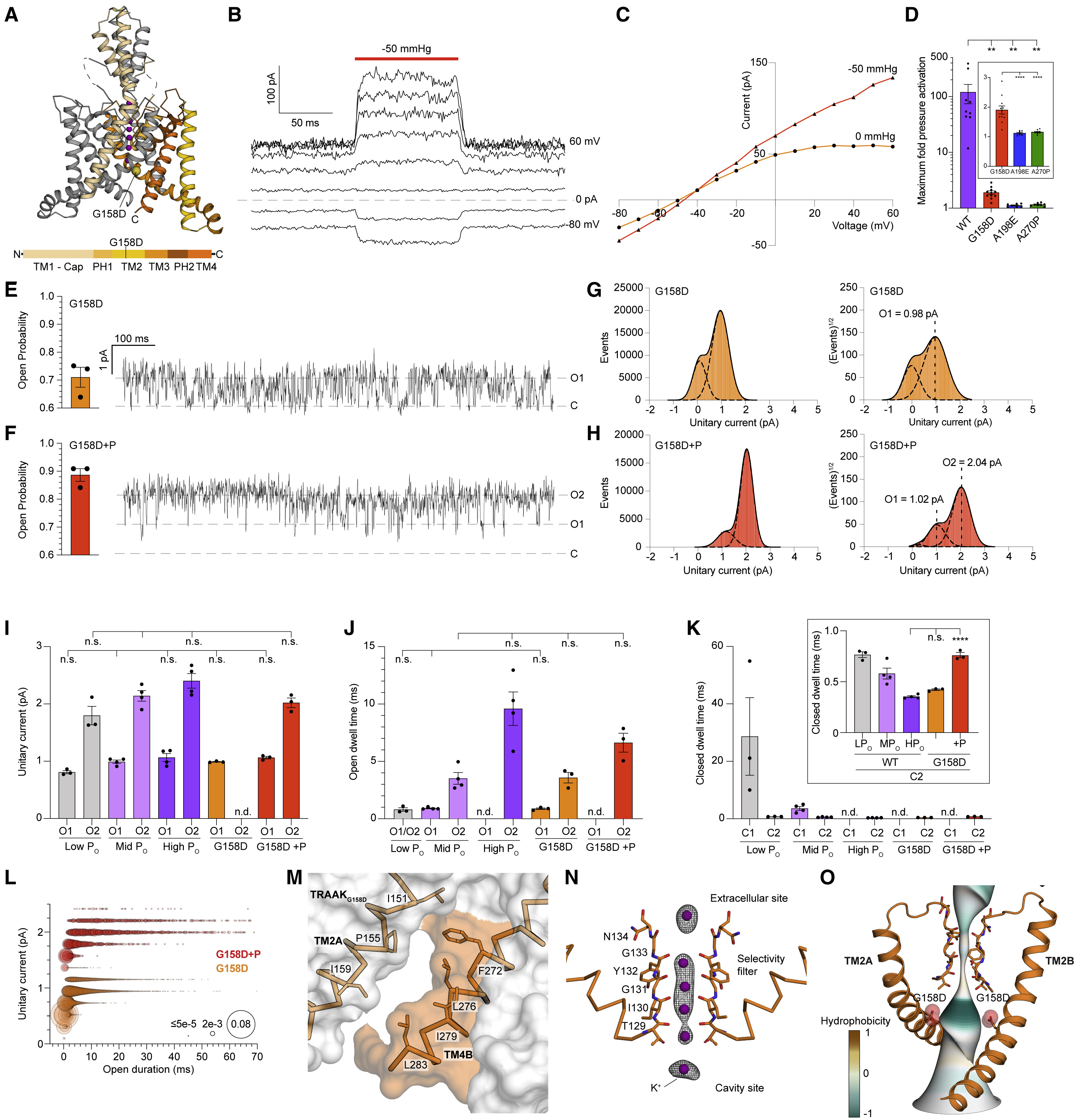 Figure 4. The gain-of-function mutation TRAAKG158D promotes a short-duration, low-conductance TM4-down open state (A) Crystal structure of TRAAKG158D. Side view from the membrane plane with one protomer gray and the second protomer colored according to the key below. G158D is shown as a yellow sphere, and K+ ions are colored purple. (B) Macroscopic currents from a TRAAKG158D-containing patch in response to a voltage step protocol (Vhold = 0, Vtest = â80 to 80, ÎV = 10 mV, 20 mV intervals displayed) with a pressure step applied at each voltage (dark orange bar). (C) Current-voltage relationship from (B). (D) Maximum fold activation by pressure of macroscopic TRAAKWT, TRAAKG158D, TRAAKA198E, and TRAAKA270P currents with expanded scale in inset (119.8 ± 45.38, 1.91 ± 0.14, 1.12 ± 0.02, and 1.16 ± 0.02, respectively, mean ± SEM, n = 9, 11, 7, and 8, ââp < 0.0021, ââââp < 0.0001 [one-way ANOVA with Dunnett correction]). (E and F) Open probability calculated from all (E) TRAAKG158D and (F) TRAAKG158D with pressure (+P) records (left, PO = 0.71 ± 0.04 and PO = 0.89 ± 0.02 [mean ± SEM, n = 3 patches]) and 1 s portion from representative recordings. (G and H) All event (left) and square root all event (right) current histograms from representative (G) TRAAKG158D and (F) TRAAKG158D+P recordings. (I) Unitary currents of TRAAKWT LPO, MPO, HPO, TRAAKG158D, and TRAAKG158D+P O1 and O2 states (0.81 ± 0.03 pA and 1.80 ± 0.16 pA, 0.99 ± 0.03 pA and 2.14 ± 0.09 pA, 1.07 ± 0.07 pA and 2.41 ± 0.13 pA, 0.99 ± 0.01, and 1.06 ± 0.02 and 2.02 ± 0.08 pA, respectively). (J) Open dwell times of TRAAKWT LPO, MPO, HPO, TRAAKG158D, and TRAAKG158D+P O1 and O2 states (0.80 ± 0.15 ms, 0.91 ± 0.05 ms and 3.52 ± 0.51 ms, 9.60 ± 1.46 ms, 0.88 ± 0.07 and 3.58 ± 0.46 ms, and 6.63 ± 0.83 ms, respectively). (K) Closed dwell times of TRAAKWT LPO, MPO, HPO, TRAAKG158D, and TRAAKG158D+P C1 and C2 states (28.70 ± 13.50 and 0.77 ± 0.03 ms, 3.59 ± 0.67 and 0.58 ± 0.05 ms, 0.35 ± 0.01 ms, 0.42 ± 0.01 ms, and 0.76 ± 0.03 ms, respectively). For (I)â(K), data are mean ± SEM, n = 3, 4, 4, 3 and 3 patches; n.d., not determined; n.s., not significant, ââââp < 0.0001 (one-way ANOVA with Tukey correction). (L) Unitary current-open dwell time relationships for TRAAKG158D, and TRAAKG158D+P open events and an overlay at expanded timescale. Bubble size is proportional to percentage of open events. (M) View of the membrane-facing cytoplasmic half of TM4 in TRAAKG158D. (N) Ions in the TRAAKG158D-K+ structure. Polder omit Fo-Fc density (gray) around K+ ions (purple) displayed at 6.5 and 6 Ï for selectivity filter and extracellular and cavity ions, respectively. (O) The conduction path in TRAAKG158D colored by hydrophobicity. G158D increases cavity electronegativity to promote a TM4-down open state. See also Figures S1âS7 and Tables S1 and S2. |