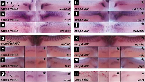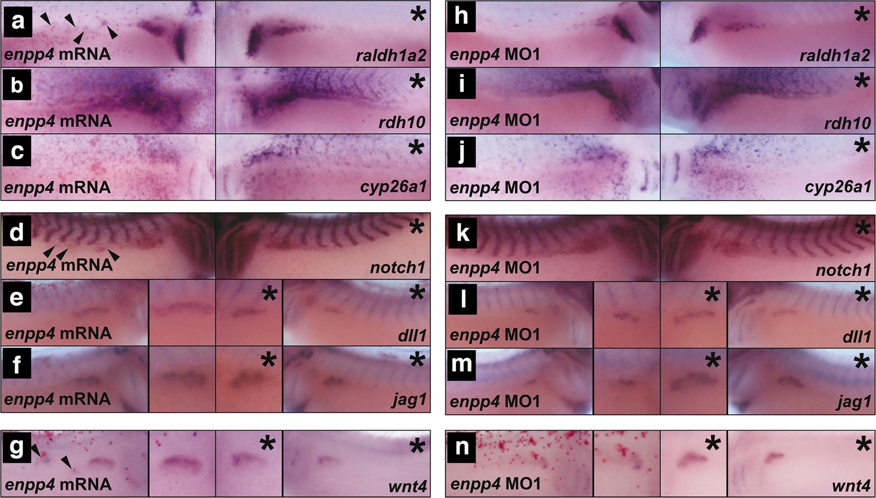 Fig. 4: Microinjection of enpp4 mRNA and MO affect the expression of retinoic acid synthesis enzymes, notch and wnt signalling molecules. aâg Embryos targeted with 2âng of enpp4 and 250âpg of LacZ mRNA or hân 10âng of enpp4 MO1 and 250âpg of LacZ mRNA were fixed at stage 28 and examined by whole-mount in situ hybridization with the following probes: raldh1a2 (a, h), rdh10 (b, i), cyp26a1 (c, j), notch1 (d, k), dll1 (e, l), jag1 (f, m) and wnt4 (g, n). The asterisks denote the control, uninjected sides. Arrowheads indicate ectopic staining of the marker gene (see also Supplementary Table 3 and Supplementary Fig. 4). |