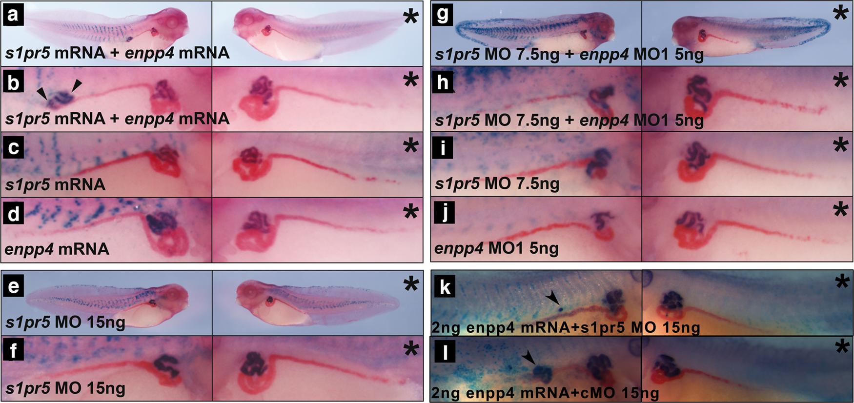 Fig. 6: Enpp4 pronephric functions are mediated by the S1pr5 receptor. Injected embryos were examined by 3G8/4A6 antibody staining following a, b double targeted injection of 2âng s1pr5.l mRNA and 1âng of enpp4 mRNA, c single targeted injection of s1pr5.l, d enpp4 mRNA or e, f embryos injected with 15âng of s1pr5.L MO. g, h Double targeted injection of 7.5âng of s1pr5.L MO and 5âng of enpp4 MO1. i, j Single targeted injection of s1pr5.L MO (i) or enpp4 MO1 (j). k, l Double targeted injection of 15âng of s1pr5.L MO and 2âng of enpp4 mRNA (k) and 15âng of cMO and 2âng of enpp4 mRNA (l). An asterisk denotes the control uninjected side. An arrowhead indicates ectopic 3G8 staining (see also Supplementary Table 5 and Supplementary Figs. 6 and 7) |