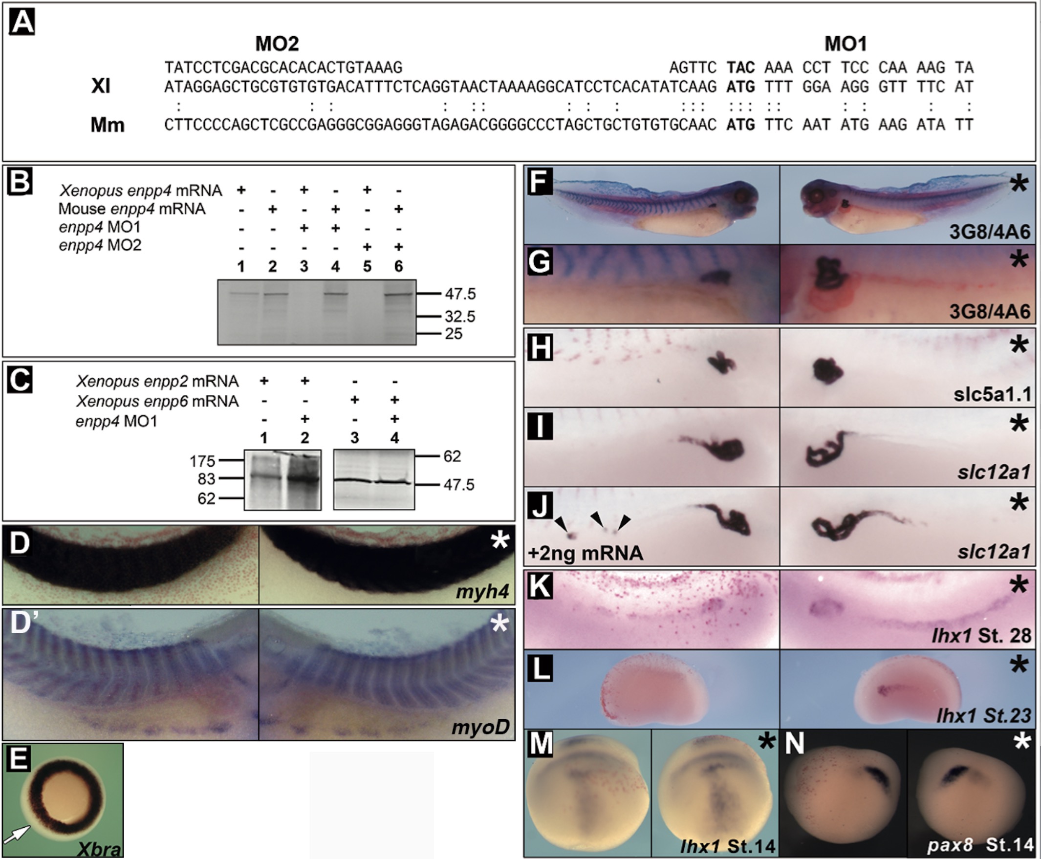 Fig. 2: MO knock-down of enpp4 expression disrupts pronephros formation. Embryos targeted with 10âng of enpp4 MO1 or 10âng of both enpp4 MOs (c, n) and 250âpg of lacZ mRNA were examined by 3G8/4A6 antibody staining (aâc) or whole-mount in situ hybridization with the following probes: slc5a1.1 (d), slc12a1 (e, f), clcnkb (g) and gata3 (h) at stage 37/38; wt1 (i) and nphs1 (j) at stage 33/34, lhx1 (kân) at stages 28, 24 and 14, pax8 (o) at stage 14. The embryo shown in (f) was co-injected with 2âng of mouse Enpp4 mRNA to rescue enpp4 knock-down phenotype. The asterisk denotes the control, uninjected side of each embryo. Blank arrowheads in (h) indicate the anterior limit of gata3 expression. See also Supplementary Table 2 for raw data and statistical analyses and Supplementary Figs. 2 and 3. |