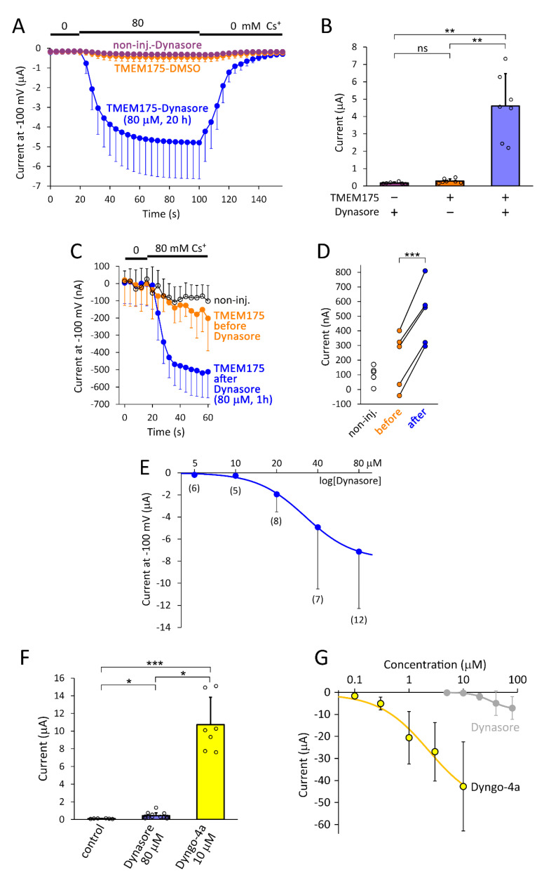 Figure 1. Dynasore and dyngo-4a increase TMEM175 current in the plasma membrane. (A). Xenopus oocytes expressing mouse TMEM175 and non-injected control cells (non-inj.) were treated with dynasore (80 μM, 20 h) or vehicle (DMSO), as indicated on the graph. The currents were measured by two-electrode voltage clamp at â100 mV, when the extracellular NMDG solution was changed to 80 mM [Cs+] and back, as indicated above the curves (n = 6 or 7 cells, in each group). (B). Statistical evaluation of the effects of TMEM175 expression and dynasore on the Cs+ currents (as indicated below the columns, using the data plotted in panel A). The oocytes derived from the same cell preparation. ** p < 0.005 (Welchâs ANOVA, Dunnett T3 post hoc test) (C). The average cesium currents in the oocytes expressing TMEM175, before (orange) and after the short dynasore treatment (80 μM, 1 h, blue, n = 5, the cells were measured twice). As a reference, the currents of non-injected cells without dynasore treatment are also shown (black, n = 5). (D). Statistical evaluation of the data plotted in panel C. The increase of TMEM175 current in response to dynasore (1 h) is shown for each cell. *** p < 0.001 (paired t-test) (E). Dose-response relationship between dynasore concentration (5, 10, 20, 40, 80 µM) and TMEM175 Cs+ current. Dynasore was applied overnight (for 20 h). The numbers in the brackets indicate sample size. The cells derived from two oocyte preparations. (F). Three groups of oocytes expressing TMEM175 were incubated in the presence of Dynasore (80 µM, n = 14) or Dyngo-4a (10 µM, n = 7) for 20 h, or in control solution (control, n = 6). The oocytes derived from the same cell preparation. TMEM175 current was measured in 80 mM EC K+ at â100 mV. * p < 0.05, *** p < 10â4, (KruskalâWallis ANOVA) (G). Dose-response relationship between Dyngo-4a concentration (0.1, 0.3, 1, 3, 10 µM) and TMEM175 K+ current was determined in another oocyte preparation (n = 5, for each concentration, applied for 20 h). As an illustration, the dynasore dose-response curve from panel E is also included (grey curve), although it has been measured in different cell preparations and with Cs+ instead of K+. (Error bars indicate standard deviation (S.D.), ns: not significant). |