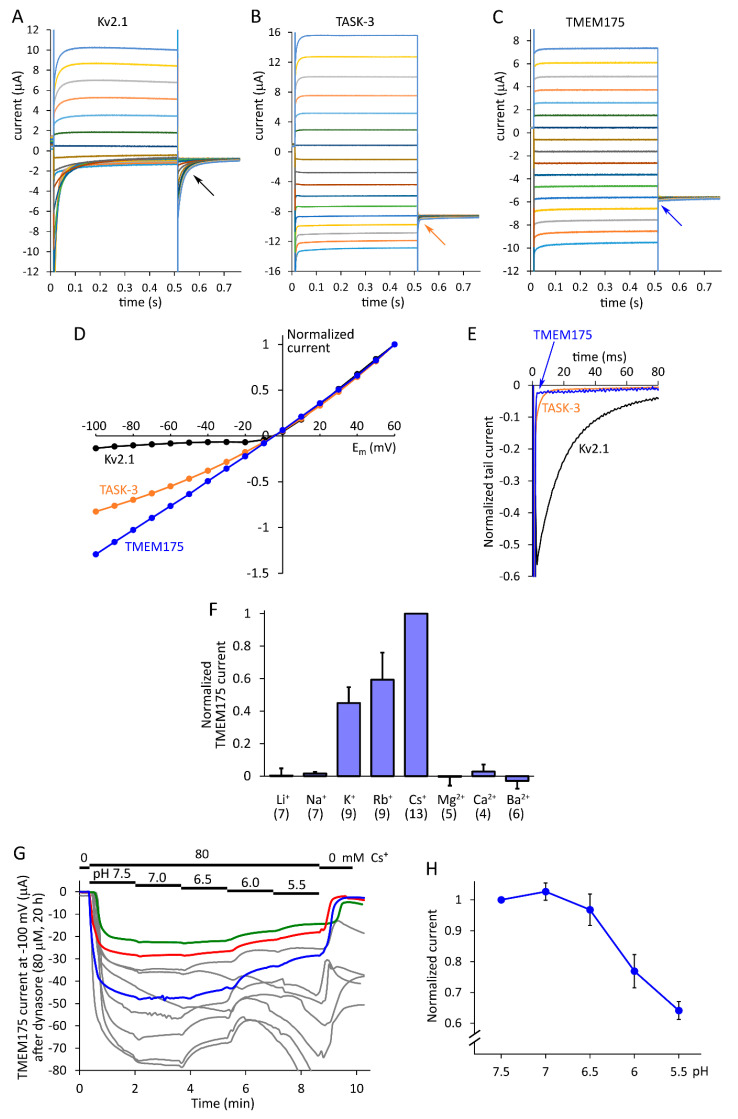 Figure 2. TMEM175 was compared to KV2.1 and TASK-3 under identical conditions, and TMEM175 ion selectivity and pH-sensitivity were determined in the plasma membrane. (AâC). The currents of three representative oocytes expressing rat KV2.1, mouse TASK-3, or mouse TMEM175 were measured in 80 mM EC K+, during 500 ms-long voltage steps from â100 to +60 mV in 10 mV increments, from a holding potential of 0 mV. This was followed by a voltage step to â60 mV, in order to record the deactivation kinetics (tail currents, as indicated by the oblique arrows). TMEM175 current was induced by the application of dyngo-4a (10 µM, 20 h). Representative recordings with similar current amplitudes and reversal potential (close to â5 mV in 80 mM EC K+) were selected. The non-specific leak (in 2 mM EC K+ at â100 mV) was negligible in these cells. (D). Current-voltage (IâV) relationships of the three channel types measured at 0.5 s in panels (AâC). The currents were normalized to the maximum value at +60 mV. (For further data, see supplementary Figure S2.) (E). Normalized tail currents at â60 mV, following the +60 mV voltage steps from the three (AâC) recordings. The current at the end of the voltage step to â60 mV was taken as the baseline, and the tail current amplitudes were normalized to the value measured at the end of the voltage step to +60 mV. (F). The ion selectivity profile of mouse TMEM175 was determined in the plasma membrane of Xenopus oocytes treated with dynasore (80 µM, 20 h). The currents were measured at â100 mV with two-electrode voltage clamp in extracellular solutions containing 80 mM of the cations indicated below the graph (the divalent cation solutions were hyperosmotic). The non-specific leak current measured in NMDG was subtracted, and the data were normalized to the Cs+ current in each cell. The numbers in the brackets indicate sample size. (G). The sensitivity of TMEM175 to acidification was measured in Xenopus oocytes. Considering the standard topology of vesicular insertion into the plasma membrane, the lysosomal luminal side of TMEM175 is exposed to the EC space. The pH was gradually decreased in the presence of 80 mM Cs+, as indicated above the recordings. Each curve represents the measurement of a cell. In the majority of recordings (grey curves), the acidification activated an endogenous conductance of the oocyte. Thus we could only test the effect of acidification to pH 5.5, although lysosomal pH may be as low as 4.5. The three recordings (green, red and blue), which returned to baseline at the end of the measurement in the NMDG solution (0 mM Cs+), were selected for further evaluation, because these were not affected by the pH-sensitive endogenous conductance. Dynasore (80 µM, 20 h) induced robust TMEM175 currents in this cell preparation. (H). Normalized TMEM175 current amplitudes at different pH values. Data points were calculated from the recordings in panel G (n = 3). Note the discontinuous vertical axis. |