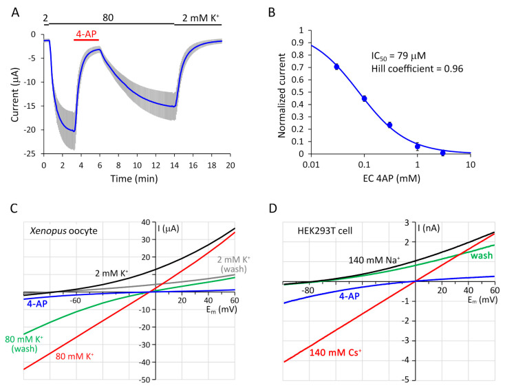 Figure 3. Voltage-dependent inhibition of TMEM175 by 4-aminopyridine (4-AP). (A). TMEM175 current is robustly inhibited by extracellular (EC) 4-aminopyridine at â100 mV (4-AP, 1 mM, red bar). Average TMEM175 currents are plotted (n = 5). The EC K+ concentration was changed from 2 to 80 mM and back as indicated above the graph. (B). Dose-response relationship between EC 4-AP concentration and TMEM175 current. The current was measured at â100 mV in 80 mM EC K+, in the presence of gradually increasing concentrations of 4-AP (0.03, 0.1, 0.3, 1, 3 mM; n = 5 cells treated overnight with 10 µM dyngo-4a). (C). Current-voltage (IâV) relationships of mouse TMEM175 in different EC solutions, in an oocyte treated with 10 µM dyngo-4a for 20 h. The solutions were applied in the following order: 2 mM K+ (black curve), 80 mM K+ (red curve), 1 mM 4-AP in the presence of 80 mM K+ (blue curve), 80 mM K+ after 300 s washout of 4-AP (wash, green curve), and finally 2 mM K+ again (wash, grey curve). The currents were measured at the end of 500-ms voltage steps from â100 mV to +60 mV in 10 mV increments, and the data points were interpolated with line segments. Representative of three similar recordings. (D). Current-voltage (IâV) relationships of mouse TMEM175 expressed in a HEK293T cell, treated overnight with 80 μM dynasore. The currents were measured by voltage ramps from â100 to +60 mV for 800 ms, in different EC solutions, containing: 140 mM Na+ (black), 140 mM Cs+ (red), 1 mM 4-aminopyridine in the presence of 140 mM Cs+ (4-AP, blue), and 140 mM Na+ again after the washout of 4-AP (wash, green). The pipette solution contained 140 mM Cs+. Representative of four similar recordings. |