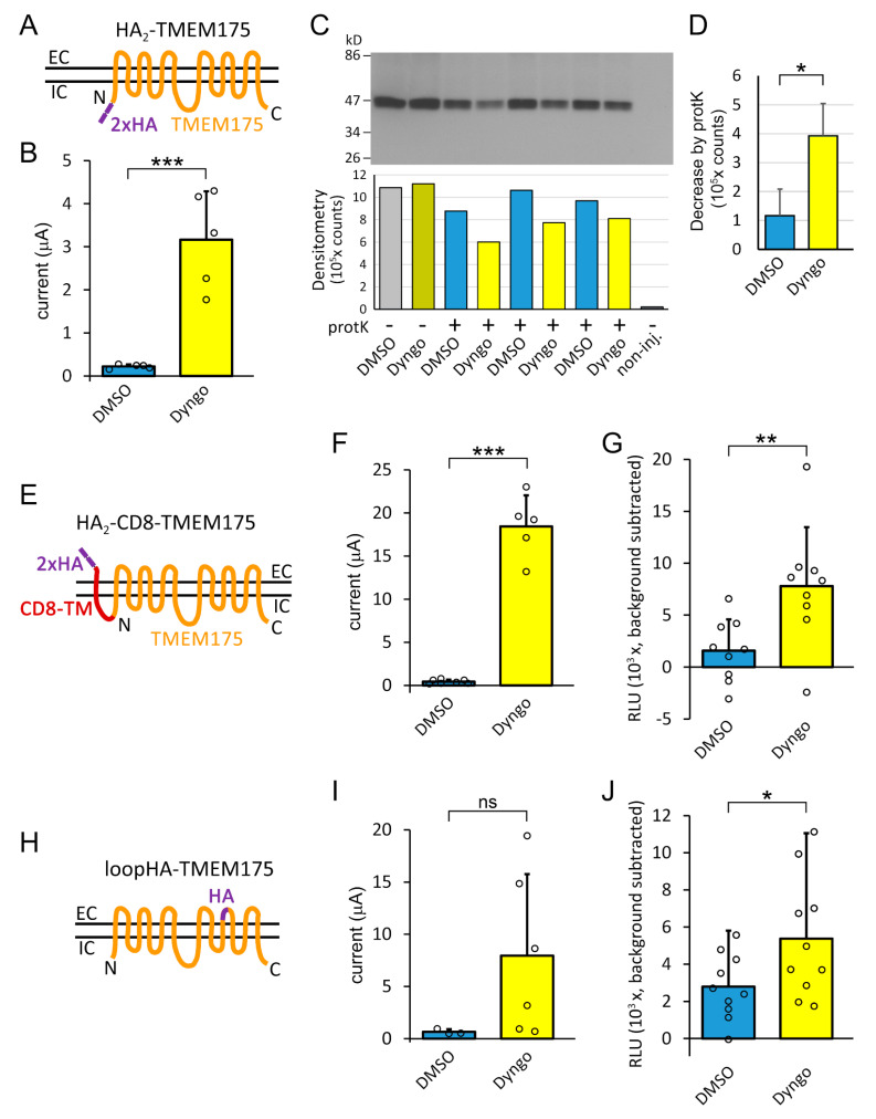 Figure 4. Dyngo-4a increases the amount of TMEM175 protein in the plasma membrane. (A). Schematic transmembrane topology of the HA2-TMEM175 construct with the intracellular, N-terminal double influenza haemagglutinin (HA) tag. (B). The currents of the construct introduced in panel A are increased by the treatment of the oocytes with dyngo-4a (10 μM, 20 h, *** p < 0.005 compared to DMSO, Mann–Whitney U-test). The currents were measured in 80 mM K+ at −100 mV. (C). Anti-HA immunoblot of the crude plasma membrane preparations from the oocytes expressing HA2-TMEM175 are shown. Eight groups of cells (n = 19 oocytes in each group) were treated with dyngo-4a (10 μM, Dyngo) or vehicle (DMSO), and in six groups, the proteins on the cell surface were digested with proteinase K (protK), as indicated below the graph. The proteolytic fragments are not visible on the immunoblot. No signal was detected in the control non-injected cells (non-inj., n = 19). Densitometry analysis of the bands is shown below the immunoblot. Note the lower intensity of bands in the Dyngo than in the DMSO groups. (D). Statistical analysis of the decrease of the anti-HA signals by proteinase K in the Dyngo and DMSO groups. * p < 0.05, (Student’s t-test, unpaired, homoscedastic) (E). TMEM175 structure was extended N-terminally with the single transmembrane segment of human CD8 protein, and an extracellular double-HA-tag was appended at the N-terminus. (F). The currents of the HA2-CD8-TMEM175 construct introduced in panel E are increased by the treatment of the oocytes with dyngo-4a (10 μM, 20 h, *** p < 0.005 compared to DMSO, Mann–Whitney U-test). The currents were measured in 80 mM K+ at −100 mV. (G). Luminometry data (given in relative light units, RLU) of the oocytes expressing HA2-CD8-TMEM175, and treated with dyngo-4a (10 μM, Dyngo) or vehicle (DMSO), as indicated below the graph. The signals were obtained by anti-HA indirect immunocytochemistry of fixed cells, followed by on cell surface horseradish peroxidase enhanced chemoluminescence (HRP-ECL) reaction. The background was determined by the identical reaction of non-injected oocytes. ** p < 0.02, (Student’s t-test, unpaired, homoscedastic) (H). TMEM175 was extracellularly HA-tagged by replacing a sequence of amino acids in the fifth EC loop with the HA epitope. (I). The currents of the loopHA-TMEM175 construct introduced in panel H shows the tendency to be increased by the treatment of the oocytes with dyngo-4a (10 μM, 20 h, p = 0.07 compared to DMSO, Mann–Whitney U-test). The currents were measured in 80 mM K+ at −100 mV. (J). Luminometry data with loopHA-TMEM175 in a similar experiment, as shown in panel G. * p < 0.05, (Student’s t-test, unpaired, heteroscedastic). |
