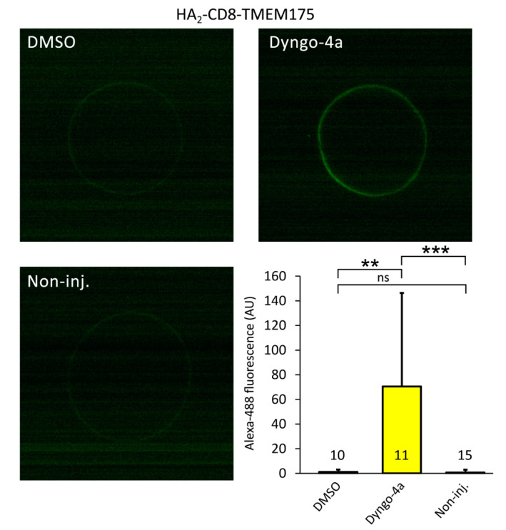 Figure 5. Confocal microscopy indicates that TMEM175 surface expression is increased after the application of dyngo-4a. The upper two images show the representative optical sections of Xenopus oocytes expressing the HA2-CD8-TMEM175 construct, and fixed after the application of Dyngo-4a (10 μM, 20 h) or DMSO, as indicated on the panels. The extracellular HA-tags were detected by the binding of a mouse anti-HA primary antibody, followed by an anti-mouse secondary antibody conjugated with Alexa Fluor 488. The left lower panel (Non-inj.) shows the background immunofluorescence of a representative non-injected control oocyte after identical immunostaining. The surface immunofluorescence was significantly more intense after the application of dyngo-4a on the oocytes expressing HA2-CD8-TMEM175 than after the treatment with DMSO, or that of the non-injected cells, as indicated on the column graph. The numbers above (or in) the columns indicate the number of measured oocytes. For the whole image set, see supplementary Figure S4. ** p < 0.01, *** p < 10â4 (multiple comparisons after KruskalâWallis ANOVA), ns: not significant. |