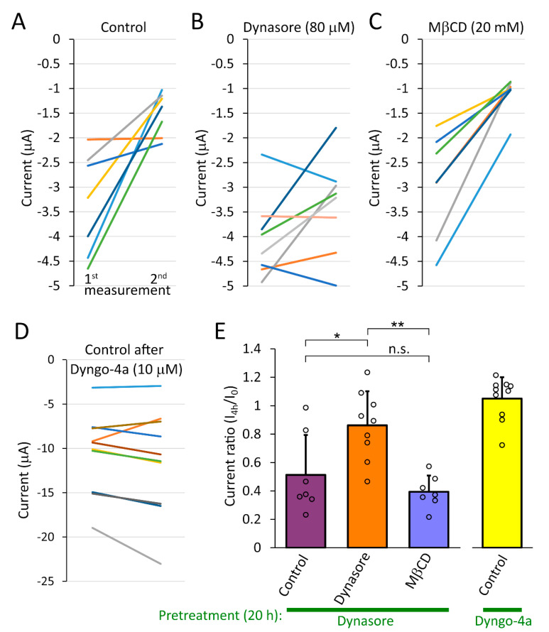 Figure 6. TMEM175 current rapidly decreases after the withdrawal of dynasore. (A–C). Mouse TMEM175 K+ current was measured in Xenopus oocytes after 20 h treatment with 80 μM dynasore (1st measurement). The cells were subsequently incubated under different conditions for 4 h: in control medium ((A). Control), in the continued presence of 80 μM Dynasore ((B). Dynasore), or in the presence of 20 mM methyl-β-cyclodextrin ((C). MβCD), and finally, the K+ current was measured again in the same cell (2nd measurement). Each colored line interconnects the two current values of a single cell. Two lines nearly overlap in (C). (D). TMEM175-expressing oocytes were treated overnight with 10 µM dyngo-4a, and subsequently the K+ currents were measured twice as in panel A, before and 3.5 h after the withdrawal of the inhibitor (i.e., after the incubation in control medium, Control). (E). Statistical analysis of the data shown in panels A, B, C, and D. The currents were normalized to the initial value at the 1st measurement (Current ratio, I4h/I0). One cell with high TMEM175 expression (9.9 to 8.8 μA) in the Dynasore group is shown only here, but not in panel B. * p < 0.02, ** p < 0.002 (one-way ANOVA, Tukey HSD test). |