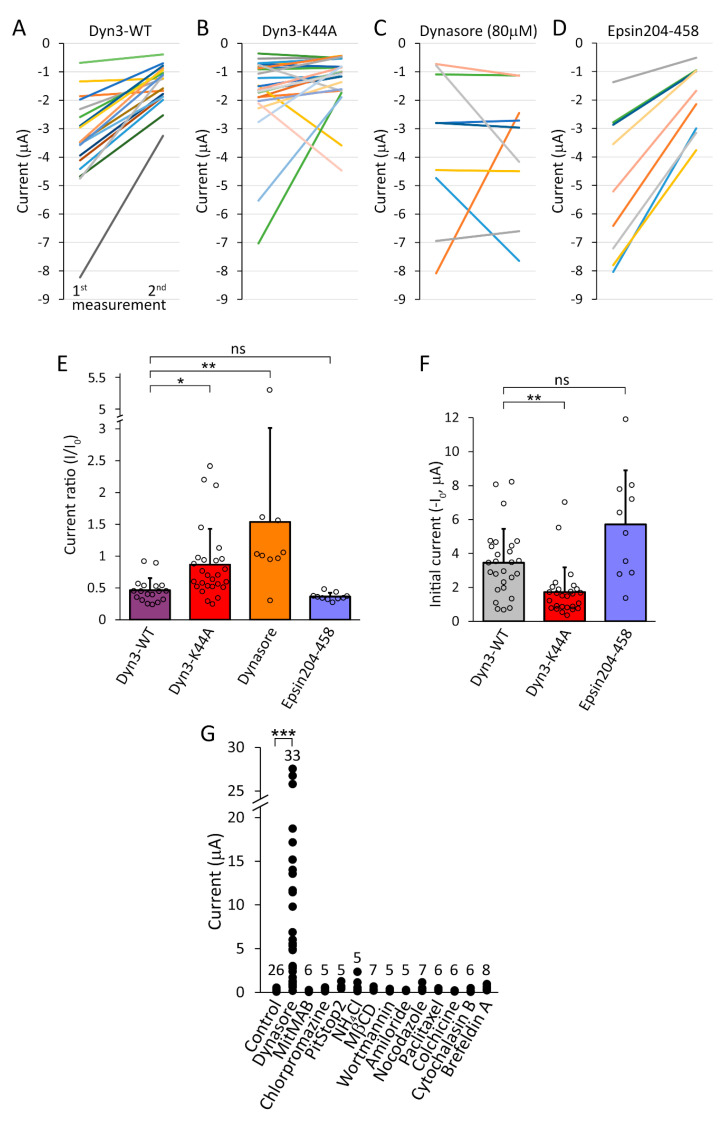 Figure 7. The effects of dominant-negative dynamin coexpression and different inhibitors of endocytosis on the TMEM175 current. (AâF). The effects of dominant-negative dynamin coexpression on the TMEM175 current induced by dynasore, and the decay of this current after the withdrawal of the inhibitor, were examined. The degree of TMEM175 current reduction was measured in four groups of oocytes treated with dynasore (80 μM, 20 h), using the protocol introduced in Figure 6. The cells were incubated for 4 h in the absence or presence of dynasore before the second measurement of TMEM175 current. Each colored line indicates the current change in a single cell. The oocytes derived from two preparations. (A). In the negative control group (Dyn3-WT), TMEM175 was coexpressed with wild type dynamin-3, and dynasore was absent between the two measurements of the K+ current. (B). In this group (Dyn3-K44A), TMEM175 was coexpressed with dominant-negative K44A mutant dynamin-3, and dynasore was absent between the two measurements. (C). In the positive control group (Dynasore (80 μM)), TMEM175 was coexpressed with wild type dynamin-3, however, dynasore was present between the two measurements. (D). In this group (Epsin204-458), TMEM175 was coexpressed with the clathrin-mediated endocytosis inhibitor DPW domain of epsin, and dynasore was absent between the two measurements. (E,F). Statistical analysis of the data shown in panels AâD. The currents were normalized to the initial value at the 1st measurement (Current ratio, I/I0, (E)) or the initial current amplitude (âI0 at the 1st measurement) is plotted (F). Current data of the 1st measurements from panels A and C are pooled for the Dyn3-WT group of panel F (first grey column). One cell with high TMEM175 expression (11.9 to 4.3 μA) in the Epsin204-458 group is shown only in panel E and F, but not in D. The omission of the data point of 5.34-fold current increase from the Dynasore (80 μM) group would not affect the statistically significant differences in this experiment. * p < 0.02, ** p < 0.002 (multiple comparisons after KruskalâWallis ANOVA), ns: not significant. (G). Different inhibitors of endocytosis and modulators of cytoskeleton do not induce TMEM175 current in the plasma membrane. The oocytes expressing mouse TMEM175 were treated with the different pharmacological agents, as indicated below the graph. Each point represents a measured cell, and the number of cells is shown above the data points. The oocytes derived from six preparations and the control and dynasore-treated cells were measured from each preparation. Control cells were incubated without the active compounds, in the presence of the vehicle (DMSO), where appropriate. The applied concentrations were the following: Dynasore (80 μM), MitMAB (tetradecyl-trimethyl-ammonium-bromide, 15 μM), Chlorpromazine (50 μM), PitStop2 (40 μM), NH4Cl (15 mM #), MβCD (Methyl-β-cyclodextrin, 40 mM #), Wortmannin (1 μM), Amiloride (1 mM), Nocodazole (1 μM), Paclitaxel (50 nM), Colchicine (10 μM), Cytochalasin B (10 μM), Brefeldin A (5 μM). (# the osmotic concentration was higher during these treatments.) The compounds were applied overnight (for 20 h). *** p < 10â6 (KruskalâWallis ANOVA). |