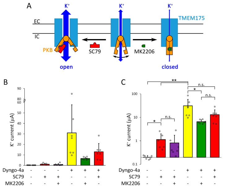 Figure 8. The effects of SC79, MK2206 and dyngo-4a on TMEM175 current. (A). Schematic illustration of TMEM175 regulation by the binding of SC79 or MK2206 to protein kinase B (PKB). (B). The oocytes expressing TMEM175 were incubated in the presence or absence of dyngo-4a (10 μM), SC79 (20 μM), and MK2206 (20 μM) for 20 h, as indicated below the graph. TMEM175 inward currents were measured in 80 mM K+ at −100 mV. (C). The same data as in panel B are plotted on a logarithmic scale to clearly visualize the differences among the groups. Statistical analysis was performed on log-transformed data. * p < 0.05, ** p < 0.001 (Welch’s ANOVA, Dunnett T3 post hoc test), n.s.: not significant. |