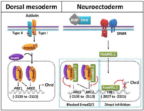 Figure 6. Proposed model of Foxd4l1.1 mediated inhibition of chrd transcription. In dorsal mesoderm for the organizer, activin signaling activates chrd transcription mediated by Smad2 and Smad3. Each Smad interacts with ARE1 and ARE2 within the chrd promoter (−2130 to −2113 bps). The neuroectoderm-specific transcription factor Foxd4l1.1 is directly bound to the FRE1 region of the chrd promoter to inhibit chrd transcription (−2027 to −2021 bps). Foxd4l1.1 physically interacts with Smad2 and Smad3 and blocks binding to the AREs.