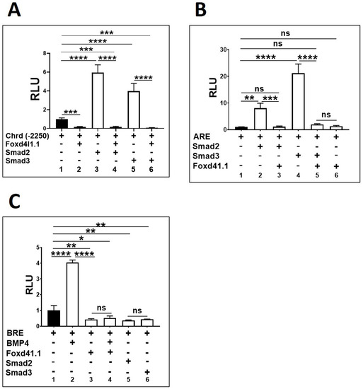 Figure 2. Ectopic presence of Foxd4l1.1 abolished chrd(−2250), ARE, and BRE mediated expression. Xenopus embryos were injected with chrd(−2250), ARE, and BRE (40 pg/embryo) with or without Foxd4l1.1, Smad2/3, or BMP4 mRNA (1 ng/embryo) at the one-cell stage and harvested at stage 11: (A) chrd(−2250) reporter activities with or without Foxd4l1.1 or Smad2/3; (B) ARE reporter activities with or without Foxd4l1.1 or Smad2/3; (C) BRE reporter activities with or without BMP4, Foxd4l1.1, or Smad2/3. The y-axis represents relative light units (RLUs). * p ≤ 0.05, ** p ≤ 0.01, *** p ≤ 0.001, and **** p ≤ 0.0001, n.s. denotes non-significant values.