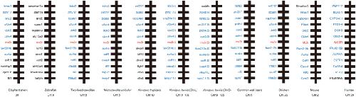 Figure 2. Synteny analysis of Xenopus laevis MC3Rs. Synteny mapping of MC3Rs with Callorhinchus milii (elephant shark), Danio rerio (zebrafish), Rhinatrema bivittatum (two-lined caecilian), Microcaecilia unicolor, Xenopus tropicalis, Xenopus laevis, Podarcis muralis (common wall lizard), Gallus gallus (chicken), Mus musculus (house mouse), and Homo sapiens (human). Genes in blue represent positional genomic conservatism during evolution among multiple species. |