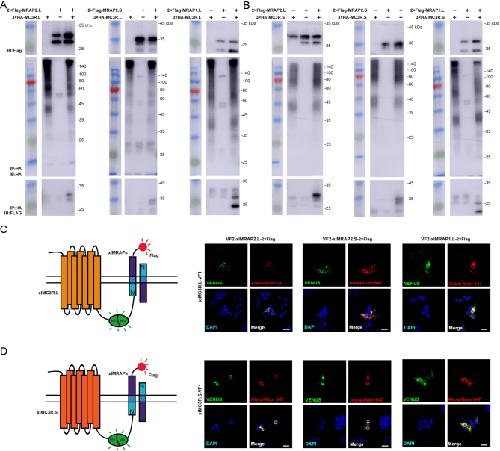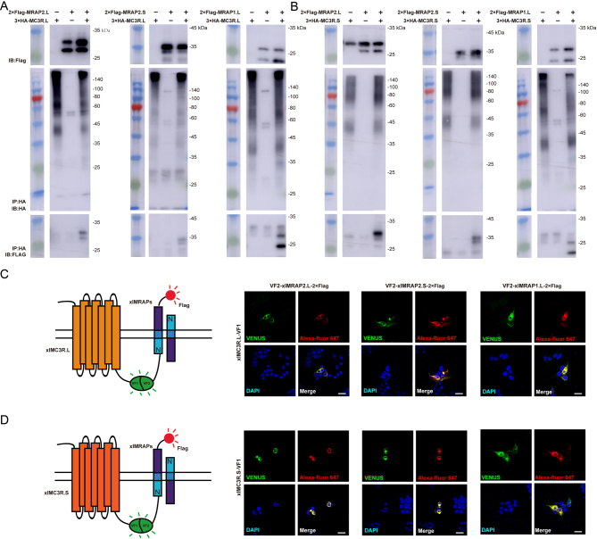 Figure 4. Protein interaction of xlMRAPs and xlMC3Rs in vitro. (A) Co-immunoprecipitation of the 3×HA-xlMC3R.L and 2×Flag-xlMRAPs. (B) Co-immunoprecipitation of 3×HA-xlMC3R.S and 2×Flag-xlMRAPs. The bimolecular fluorescence complementation assay showed the co-localizations of (C) xlMC3R.L or (D) xlMC3R.S and xlMRAPs. Venus fluorescence imaging (green) and 2-Flag (red) exhibited protein complex of xlMRAP1.L (or xlMRAP2.L/S) and xlMC3Rs. Nuclei were in blue (DAPI). Scale bar = 10 μm. |