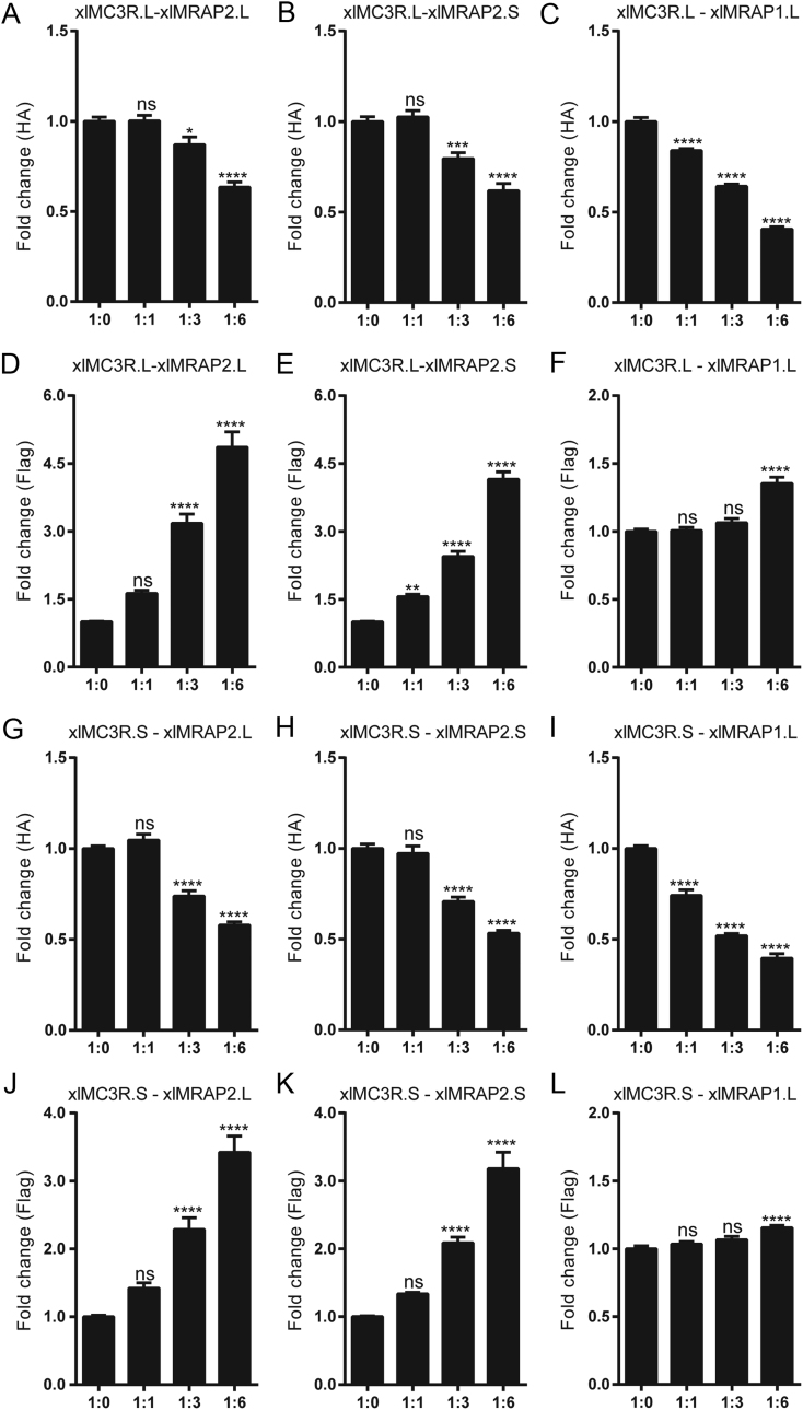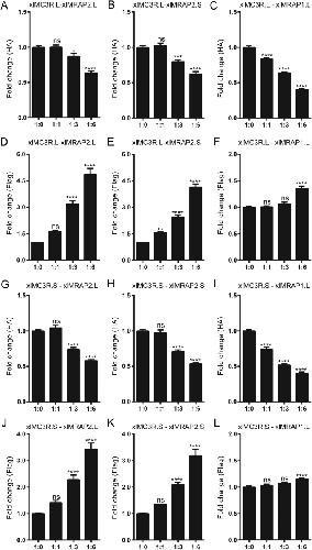 Figure 6. Alteration of the surface expression of xlMC3R.L and xlMC3R.S by xlMRAPs at ratio of 1:0, 1:1, 1:3, and 1:6. Surface expression of the N-terminally 3×HA tagged xlMC3R.L in the presence of (A) the N-terminally 2×Flag tagged xlMRAP2.L, (B) the N-terminally 2×Flag tagged xlMRAP2.S, or (C) the N-terminally 2×Flag tagged xlMRAP1.L. Whole expression of the N-terminally 2×Flag tagged xlMRAP2.L (D and J), the N-terminally 2×Flag tagged xlMRAP2.S (E and K), and the N-terminally 2×Flag tagged xlMRAP1.L (F and L). Surface expression of the N-terminally 3×HA tagged xlMC3R.S in the presence of (G) the N-terminally 2×Flag tagged xlMRAP2.L, (H) the N-terminally 2×Flag tagged xlMRAP2.S, or (I) the N-terminally 2×Flag tagged xlMRAP1.L. Each receptor/accessory protein expression level was shown as fold difference compared to HEK293T cells expressing 3×HA-xlMC3R alone. Data were plotted as the mean ± s.e.m. of three independent experiments performed in triplicate, not significant [ns], ∗P < 0.05, ∗∗P < 0.01, ∗∗∗P < 0.001, ∗∗∗∗P < 0.0001 one-way ANOVA. |