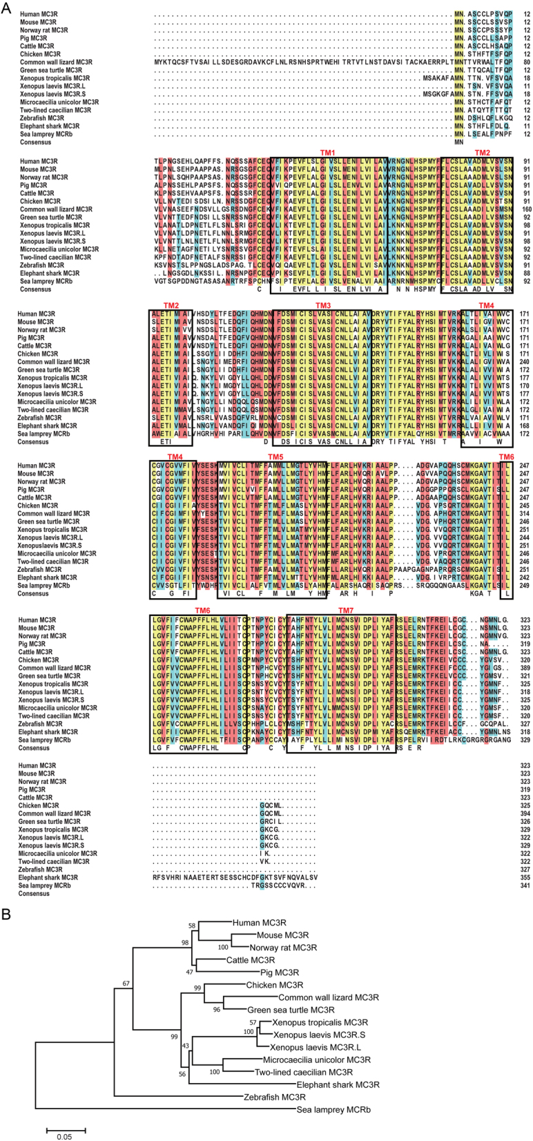 Figure 1. Protein alignment and phylogenetic analysis of Xenopus laevis MC3Rs. (A) Sequence alignments of xlMC3Rs (Xenopus laevis MC3R.L, XP_018090440.1; Xenopus laevis MC3R.S, XP_018093682.1) and other MC3Rs from human (NP_063941.3), mouse (NP_032587.1), Norway rat (NP_001020441.3), pig (NP_001116609.1), cattle (XP_010809919.1), chicken (XP_004947293.1), common wall lizard (XP_028591076.1), green sea turtle (XP_007059824.1), Xenopus tropicalis (XP_002935436.1), Microcaecilia unicolor (XP_030069319.1), two-lined caecilian (XP_029467773.1), zebrafish (NP_851303.2), elephant shark (XP_007883784.1), and sea lamprey (ABB36647.1). The blue, red, and yellow represent a homology over 50%, 75%, and 100%, respectively. (B) Dendrogram of MC3Rs was generated by the NJ analysis with Molecular Evolutionary Genetics Analysis (MEGA) software. |