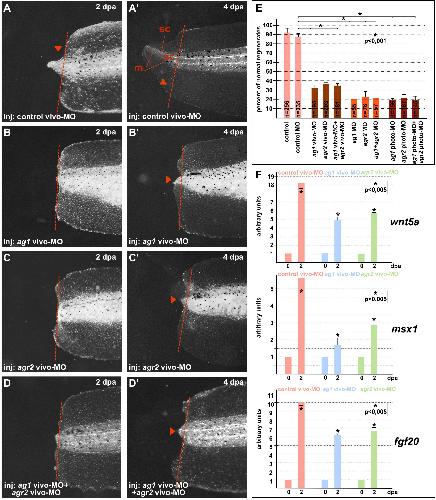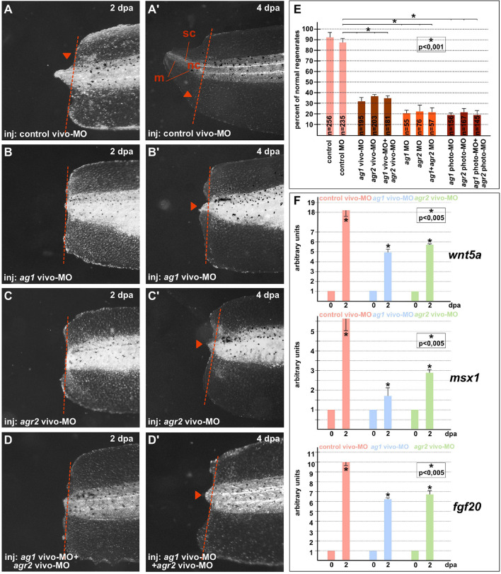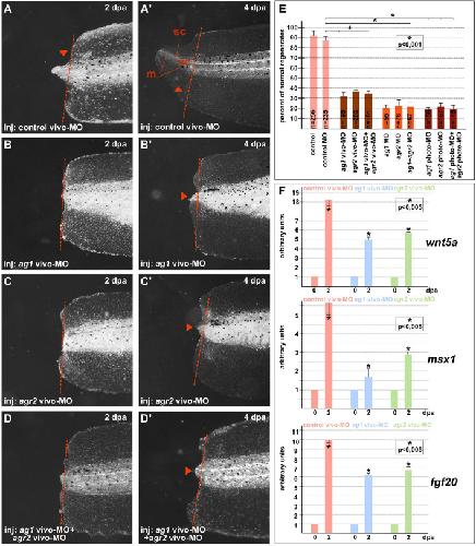Figure 1. Downregulation of ag1and/or agr2 genes leads to regeneration blockage. (A,Aâ) Imaging of Xenopus laevis tadpoles developed from embryos injected with control morpholino oligonucleotides (control MO) and regenerating tail tip at two developmental timepoints corresponding to 2 and 4 days post amputation (dpa). Lateral view, dorsal to the top. Dashed red line indicates amputation level. Sc, spinal cord; nt, neural tube; m, muscles. Tail tip regeneration is dramatically reduced if ag1 and/or agr2 genes are downregulated by injection of embryos with ag1 vivo-MO (B,Bâ), agr2 vivo-MO (C,Câ), or both (D,Dâ). (E) Quantification of normal regenerates percentage among controls and ag1/agr2 morphants. Nânumber of tails analyzed. Error bars indicate SD. Statistical significance was determined with t-test for independent samples; the results are statistically significant, p < 0.001 (asterisk). (F) qRT-PCR analysis of expression levels changes of regeneration markers wnt5a, msx1 and fgf20 during the regeneration process (at 0 and 2 dpa) in amputated tails of tadpoles injected with control, ag1 and/or agr2 vivo-MO. The value of normalized PCR signal in the 0 dpa sample, harvested immediately after amputation, was taken as an arbitrary unit in each series. Dpaâdays post amputation. Error bars indicate SD, t-test, p < 0.05 (asterisk). |