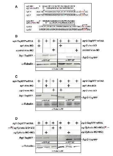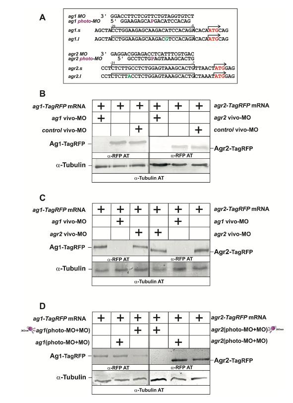 Figure S1. Vivo- and photo-morpholino oligonucleotides (MO) efficiency tests. (A) The MO (conventional and vivo-MO) and complementary photo-MO sequences and scheme of their sites on ag1 and agr2 mRNAs. (B)Results of Western blotting with rabbit anti-tRFP (Evrogen) and anti-rabbit alkaline phosphatase antibody (Sigma-Aldrich) and monoclonal anti-tubulin antibody (Sigma-Aldrich) demonstrate specific and effective inhibition of Ag1-tagRFP/Agr2-tagRFP synthesis by ag1/agr2 vivo-MO, but not by control vivo-MO. (C) Results of Western blotting demonstrate specific and effective inhibition of Ag1-tagRFP synthesis by ag1 vivo-MO, but not by agr2 vivo-MO and vice versa. (D) Results of Western blotting demonstrate specific and effective inhibition of Ag1-tagRFP or Agr2-tagRFP synthesis by ag1 (photo-MO+MO)or agr2 (photoMO+MO) only after illumination at 365 nm (violet lamp). |