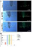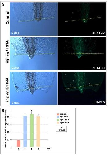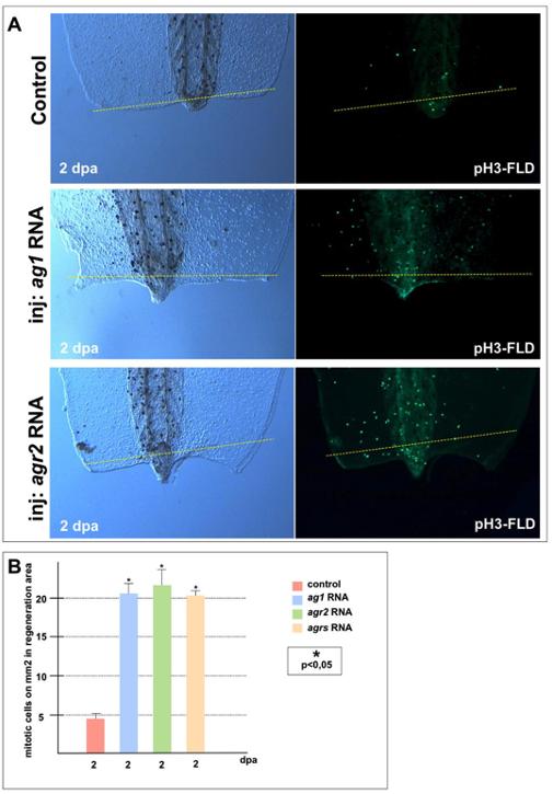 Figure S5. Overexpression of ag1/agr2 is sufficient to reactivate cell prolifertion and regeneration in the refractory period when they are naturally blocked. (A) The transmitted light and fluorescent images of tail tips of tadpoles injected with solution of RDA amputated in the refractory period after immunostaining with anti-pH3-fluorescein demonstrate very low mitotic activity in the tail tip area at 2dpa. In contrast, tadpoles injected with the solution of ag1 RNA or agr2 RNA after amputation in the refractory period demonstrate much higher proliferative activity in distal area of the tail. (B) Quantification of number of mitotic cells per 1 mm2 of tail regenerating area. Data of five independent experiments (10 tadpoles of each injection type were used in 1 experiment) were used for statistical analysis; statistical significance was determined using t-test for independent samples, p<0.05 (asterisk). Error bars indicate SD. |