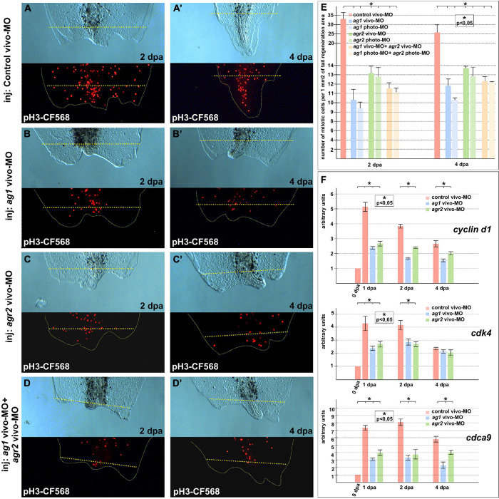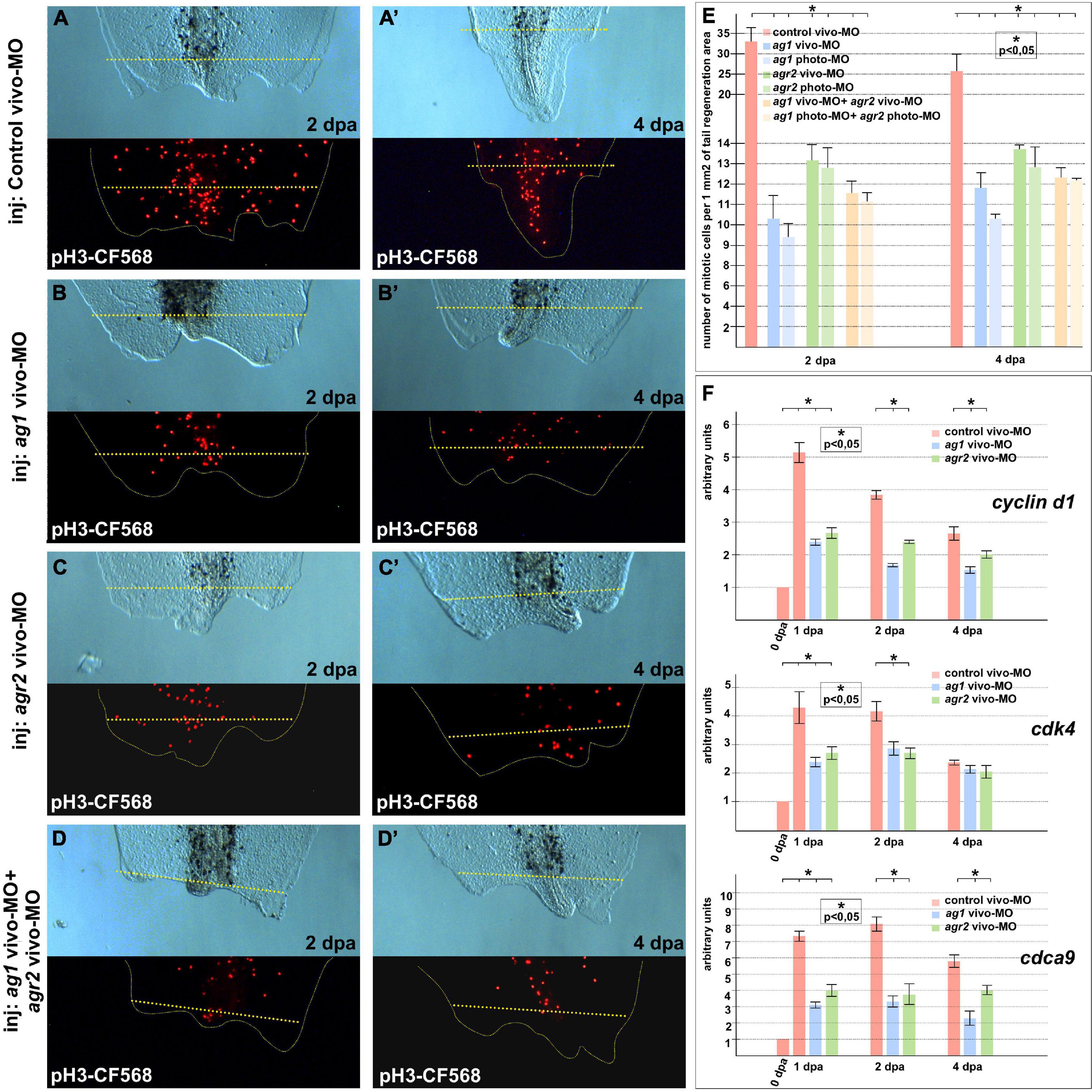 Figure 2. Cell proliferation is inhibited in regenerating tails under ag1 and/or agr2 downregulation conditions. (A,Aâ) The transmitted light and fluorescent images of regenerating tails of tadpoles injected with solution of control vivo-MO after immunostaining with primary rabbit anti-pH3 and secondary anti-rabbit antibodies conjugated with red fluorescent protein CF568 demonstrate mitotic activity in the regenerating area at 2 and 4 dpa, respectively (see E for statistics). Transmitted light and immunostained fluorescent images of tadpoles injected with ag1 vivo-MO (B,Bâ), agr2 vivo-MO (C,Câ), or a mixture of them (D,Dâ), show strong inhibition of mitotic activity at 2 and 4 dpa. Dashed yellow line indicates amputation level. (E) Quantification of number of mitotic cells per 1 mm2 of tail regenerating area. Data of five independent experiments (10 tadpoles of each injection type were used in 1 experiment) were used for statistical analysis; statistical significance was determined by t-test for independent samples, p < 0.05 (asterisk). Error bars indicate SD. (F) qRT-PCR analysis of expression levels changes of cell cycle markers cyclin d1, cdk4, and cdca9 during the regeneration process (at 0, 1, 2, and 4 dpa) in amputated tails of tadpoles injected with control, ag1 and/or agr2 vivo-MO. The value of normalized PCR signal in the 0 dpa sample, harvested immediately after amputation, was taken as an arbitrary unit in each series. Dpaâdays post amputation. Error bars indicate SD, t-test, p < 0.05 (asterisk). |