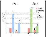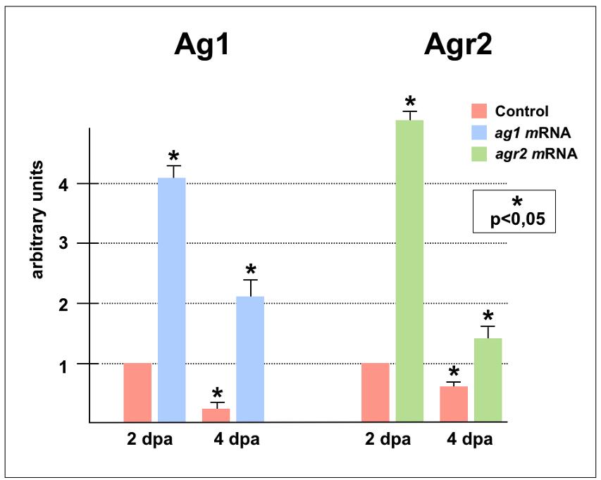 Figure S2. Tail tips of tadpoles developed from embryos injected with ag1 and agr2 mRNAs contain high level of these mRNAs in the refractory period. The qRT-PCR analysis of ag1 and agr2 expression in the tips of tails amputated in the refractory period demonstrates much higher level of ag1 and agr2 mRNAs in the tips of tadpoles developed from embryos injected with these synthetic mRNA comparing to the tips of control tadpoles. Statistical significance was determined by t-test for independent samples, p<0.05 (asterisk). Error bars indicate SD. |
