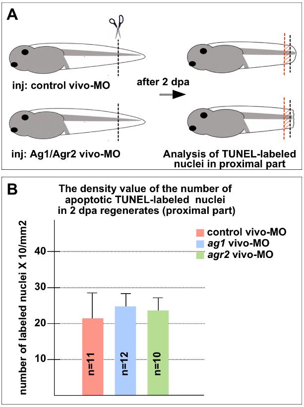 Figure S4. The apoptotic cell density in the area proximal to amputation level does not change in response to ag1 and agr2 downregulation. (A) scheme of the experiment: tadpoles tail stumps at st.40-41 were injected by control vivo-MO, ag1-vivo MO or agr2-vivo-MO. After 2 days, the tadpoles' tails were stained for the presence of apoptotic cells using the TUNNEL analysis, and then in the area located proximal to the level of amputation (between the black and red lines, the distance between which was approximately equal to half the tail width), the density of apoptotic cells was determined per 1 mm2. (B) No statistically significant difference in the apoptotic cell density was revealed between control tails and those injected with ag1-vivo MO or agr2-vivo-MO. Error bars indicate SD. |