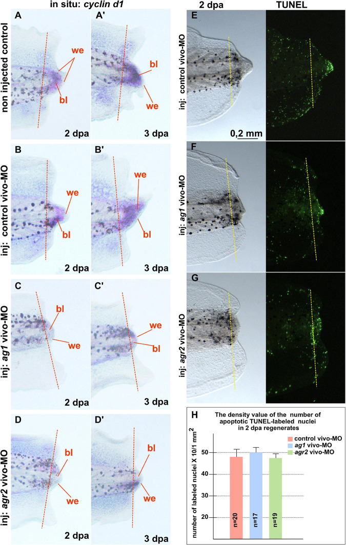 Figure 3. Downregulation of ag1 and agr2 during regeneration is accompanied by cell cycle regulator cyclin d1 expression blockage but does not affect apoptosis activity in the regenerating tail. (A,Aâ). Results of in situ hybridization of non-injected control regenerating tails as well as tails injected with control vivo-MO (B,Bâ) demonstrate active expression of cyclin D1 at 2 and 3 dpa predominantly in blastema cells. Knock-down of ag1 (C,Câ) as well as agr2 (D,Dâ) by specific vivo-MOs result in a high reduction of cyclin d1 expression at 2 and 3 dpa. Blâblastema, weâwound epithelium. Dashed red line indicates amputation level. Lateral view, distal to the right. (EâG) TUNEL analysis of apoptotic cells pattern in 2 dpa regenerating tails injected with control vivo-MO (E), ag1 vivo-MO (F) or agr2 vivo-MO (G). (H) Statistical analysis of number of TUNEL-labeled nuclei per 1 mm2 of regenerating region, distal to the amputation level (yellow dashed line). Nânumber of tails analyzed. |