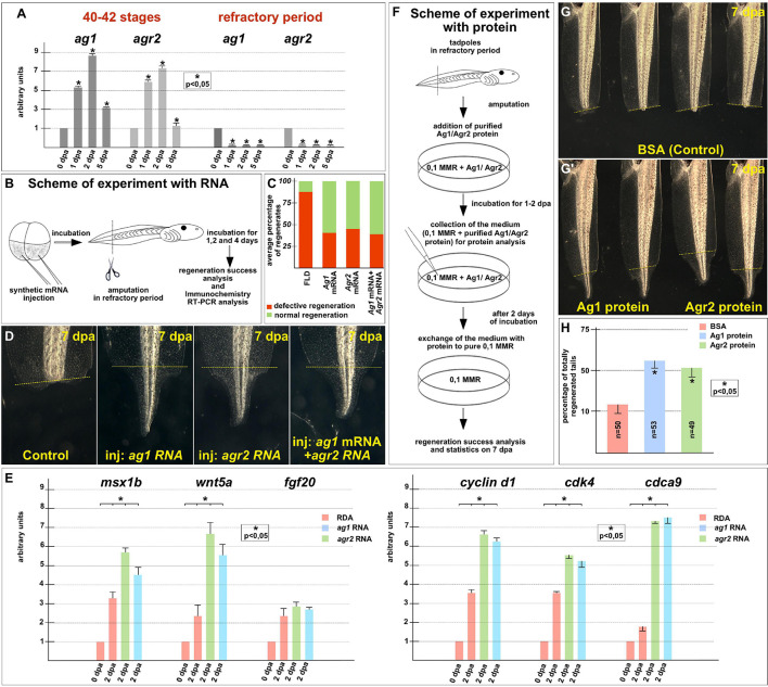 FIGURE 4. Regeneration blockage during tadpoles’ refractory period can be unlocked by ag1/agr2 over-expression or incubation in solution with purified Ag1/Agr2 proteins. (A) The qRT-PCR results show the difference in expression dynamics of ag1 and agr2 at 0–5 dpa in tadpole regenerates upon amputation at stage 40–42 or in the refractory period. The value of normalized PCR signal in the 0 dpa sample, harvested immediately after amputation, was taken as an arbitrary unit in each series. Dpa—days post amputation. Error bars indicate SD, t-test, p < 0.05 (asterisk). (B) Scheme of the experiment with ag1/agr2 over-expression and types of analysis of the regeneration process in the refractory period. (C) Statistical analysis of regeneration success of tadpoles, developed from embryos injected with a solution of FLD, either ag1 or agr2 mRNA (or both), and amputated in the refractory period. The picture shows the average values. (D) The transmitted light images of tails of corresponding tadpoles on 7 day post amputation in the refractory period demonstrate total regeneration of tails in tadpoles over-expressing either ag1 or agr2 mRNA (or both). (E) qRT-PCR analysis of expression levels changes of regeneration markers msx1b, wnt5a, and fgf20 and cell cycle markers cyclin d1, cdk4 and cdca9 during the regeneration process (at 0 and 2 dpa) in amputated tails of tadpoles injected with RDA, ag1 or agr2 mRNA solution. The value of normalized PCR signal in the 0 dpa sample, harvested immediately after amputation, was taken as an arbitrary unit in each series. Dpa—days post amputation. Error bars indicate SD, t-test, p < 0.05 (asterisk). (F) Scheme of the experiment with tadpoles amputated in refractory period and incubated in solution with BSA, Ag1 or Agr2 purified proteins (see Supplementary Material for the procedure of the recombinant proteins preparation and Supplementary Figure 3B for testing the integrity of the proteins in the medium with tadpoles). (G,G’) The transmitted light images of tadpoles tails on day 7 post amputation in the refractory period after incubation in BSA solution (G) or in solution with Ag1 or Agr2 proteins (G’) demonstrate total regeneration only in the latter variants. (H) Statistics of normally regenerated tails percentage among tadpoles amputated in refractory period and incubated with BSA or purified Ag1 or Agr2 proteins. N—total number of tadpoles used in three independent experiments. |