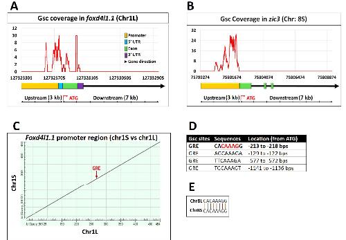 Fig. 2. Identification of GREs within the neural target genes using ChIP-seq of 3Flag-gsc injected Xenopus embryos. (A and B) Coverage plot of 3Flag-gsc within the foxd4l1.1 and zic3 promoter regions. (C) Similarity within both (chr1s and chr1l) copies of foxd4l1.1 promoter region are shown. The active GRE (â213 to â218 bps) location is highlighted by an arrow. (D) Putative GREs revealed within the foxd4l1.1 promoter region by ChIP-sequencing. (E) Consensus binding motifs of Gsc within both (chr1s and chr1l) copies of foxd4l1.1 promoter region.
