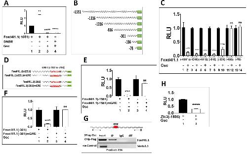 Fig. 3. Abolishment of the repressional activity of Gsc by site-directed mutagenesis of GRE within the foxd4l1.1(â1551) reporter construct. (A) foxd4l1.1(â1551) (40 pg/embryo), dnbr (1 ng/embryo), and 3Flag-gsc (1 ng/embryo) were injected at one-cell stage and reporter assay was performed at stage 11. RLU, relative reporter activity. (B) Schematic representation of serially-deleted foxd4l1.1(â1551) promoter constructs. (C) Serially-deleted foxd4l1.1 (40 pg/embryo) promoter constructs were injected with and without 3Flag-gsc (1 ng/embryo) at one-cell stage and relative promoter activity were measured at stage 11. (D) Site-directed mutagenesis scheme for foxd4l1.1(â1551) and foxd4l1.1(â301) promoter constructs, target sequences highlighted (red color and italic). (E and F) Relative reporter assay of foxd4l1.1(â1551), foxd4l1.1(â1551)mGRE, foxd4l1.1(â301), and foxd4l1.1(â301)mGRE with or with gsc were performed at stage 11. (G) 3Flag-gsc was injected at one-cell stage and ChIP-PCR was performed at stage 11. Specific primers of Foxd4l1.1 promoter region (containing GRE) were used for amplification, while ventx2.1 served as negative control. (H) zic3(â1805) reporter construct was injected (40 pg/embryo) with or without 3Flag-gsc (1 ng/embryo) and reporter assay was performed at stage 11. **P ⤠0.01; ****P ⤠0.0001; ns, non-significance.