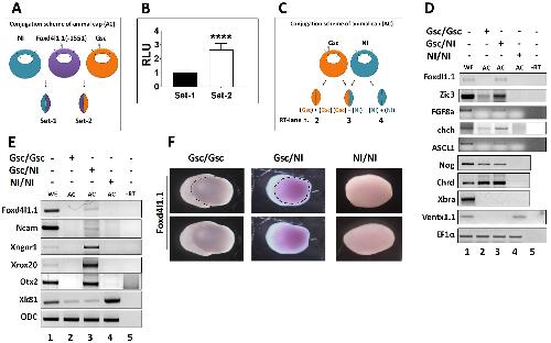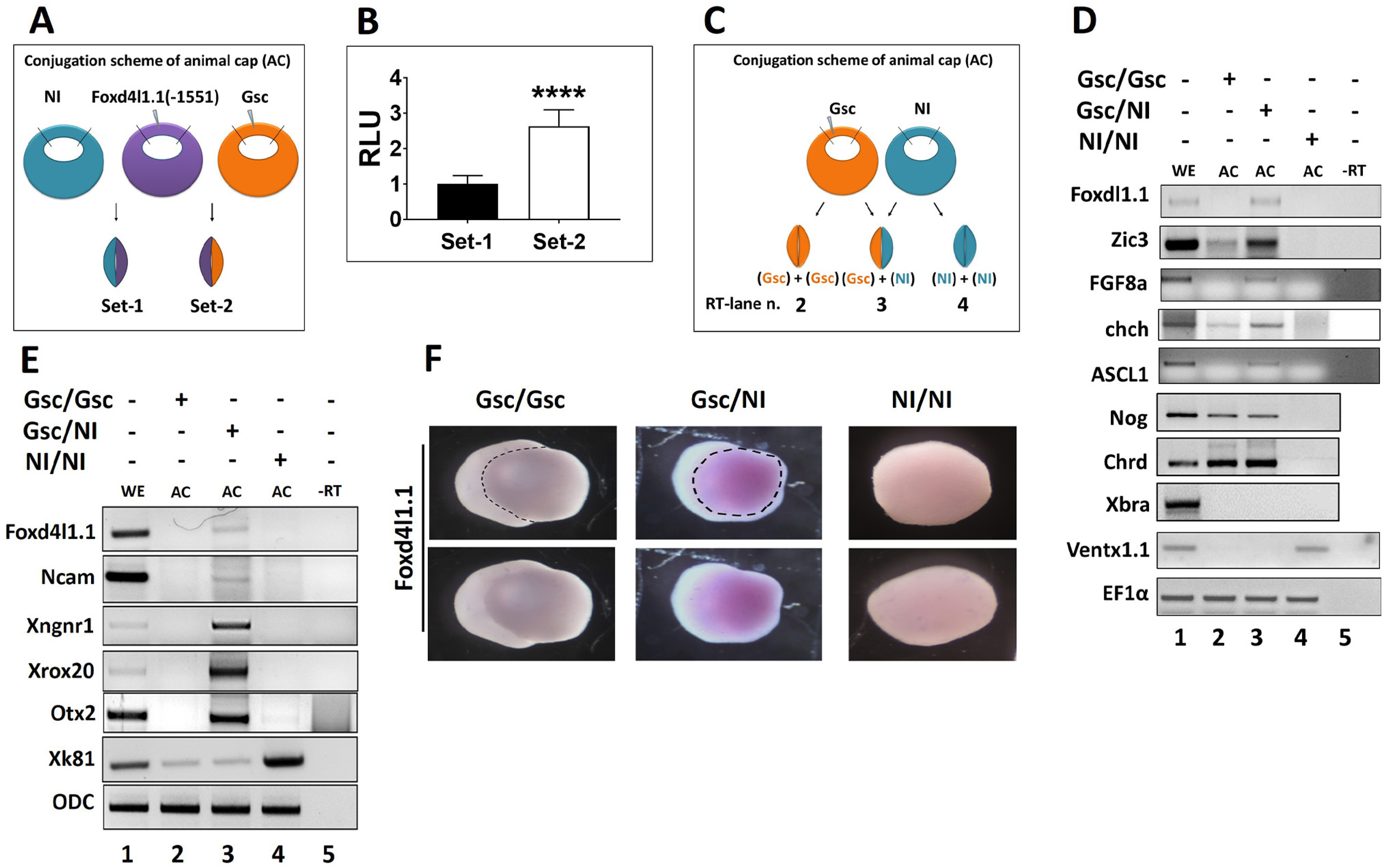 Fig. 4. A dual role of Gsc in transcriptional regulation of foxd4l1.1. In all experiments, 3Flag-gsc (1 ng/embryo) and foxd4l1.1(-1551) (40 pg/embryo) were injected at one-cell stage and the ACs were dissected at stage 8 to grow until stage 11 and 24. (A) Conjugation scheme for AC explants used. (B) The relative promoter activity are measured. RLU, relative reporter activity. ****P ⤠0.0001. (C) Schematic description of the conjugated AC explants of the embryos injected with 3Flag-gsc and NI. The expression profiles of (D) early (stage 11) and (E) late (stage 24) neural marker genes were analyzed by RT-PCR. No RT (no reverse transcriptase added) served as a negative control while WE (whole embryos) served as positive control. (F) Whole mount in situ hybridization (WISH) was performed with anti-sense foxd4l1.1 probe of at stage 11.