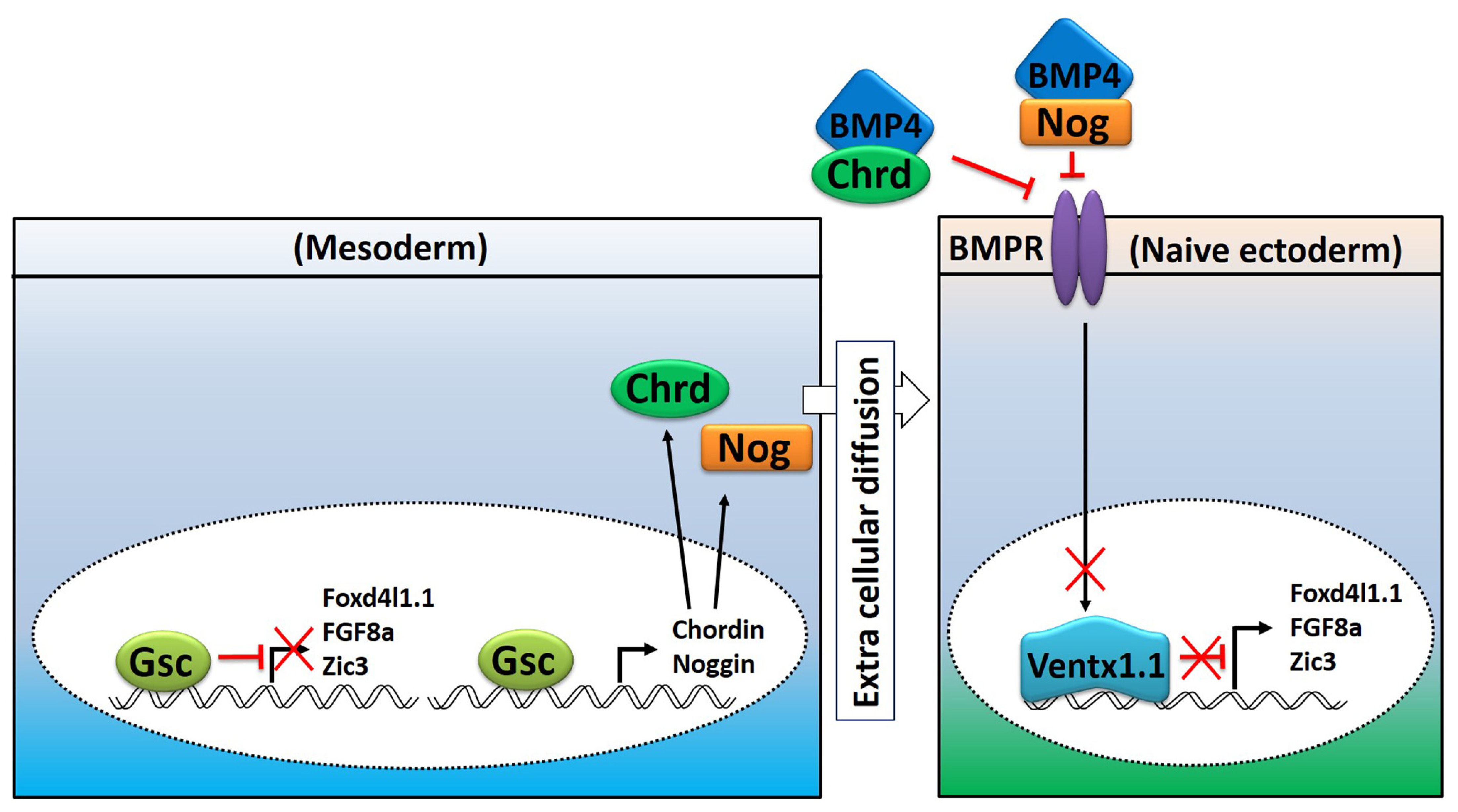 Schematic diagram depicting the dual role of Gsc in early neurogenesis. In mesoderm (dorsal organizer), Gsc inhibits the neural genes while strongly induces chordin and noggin expression. Newly translated Chordin and Noggin diffuse to neighboring cells (ectoderm) where they induce neurogenesis in a BMP inhibited manner.