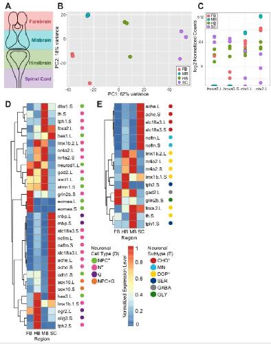 Figure 3. Expression analysis of Xenopus stage 46 across different brain regions. A) Schematic depicting the four brain regions dissected and sequenced at Xenopus Stage 46: forebrain (pink), midbrain (blue), hindbrain (green), and spinal cord (purple). B) Principal component analysis of samples collected from the X. laevis stage 46 brain in the forebrain (FB ST46, pink), midbrain (MB ST46, blue), hindbrain (HB ST46, green), and spinal cord (SC ST46, purple). Colors correspond to brain regions in Figure 3A. C) Normalized expression of hox5, a hindbrain-spinal cord marker, and otx1 and otx2, forebrain-midbrain markers, across all brain regions. Colors correspond to brain regions in Figures 3A, B. D) Heat map of cell type marker expression over ST46 tadpolebrain regions. General cell types are categorized for genes listed as NPC, neural progenitor cell (including neuroepithelial cells, radial glia, intermediate progenitors, and immature neurons); G, glial cell (including mature oligodendrocytes, Schwann cells and Schwann cell precursors, astrocytes, and microglia); N, neuron; NPC+G, progenitor cell/glial marker. E) Heat map of neuron subtype marker expression over brain region at stage 46. Specific neuronal subtypes are categorized for genes listed as CHO, cholinergic neuron; MN, mature neuron; DOP, dopaminergic neuron; SER, serotonergic neuron; GABA, GABAergic neuron; GLY, glycinergic neuron. Genes are clustered by similarity in expression across regions with complete linkage clustering, as indicated by the dendrogram to the left. Asterisks indicate significantly enriched cell types ((p<0.002 for PG, p<0.001 for N, p<0.001 for both DOP and CHO markers). Expression is normalized per-gene to the highest expression for that gene.