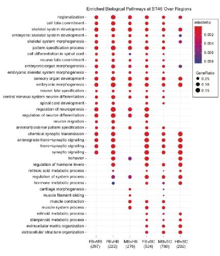 Figure 4. Enriched biological pathways in ST46 Xenopus across brain regions. GO biological pathways enriched in the set of genes differentially expressed between two regions of the tadpole stage 46 brain. Brain regions, as shown in Figure 3A are FB, forebrain; MB, midbrain; HB, hindbrain; and SC, spinal cord. Dot size corresponds to the proportion of differentially expressed genes associated with the biological pathway, and dot color refers to the adjusted p-value. The numbers along the x-axis correspond to the total number of genes differentially expressed in each comparison.