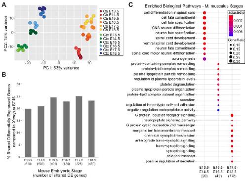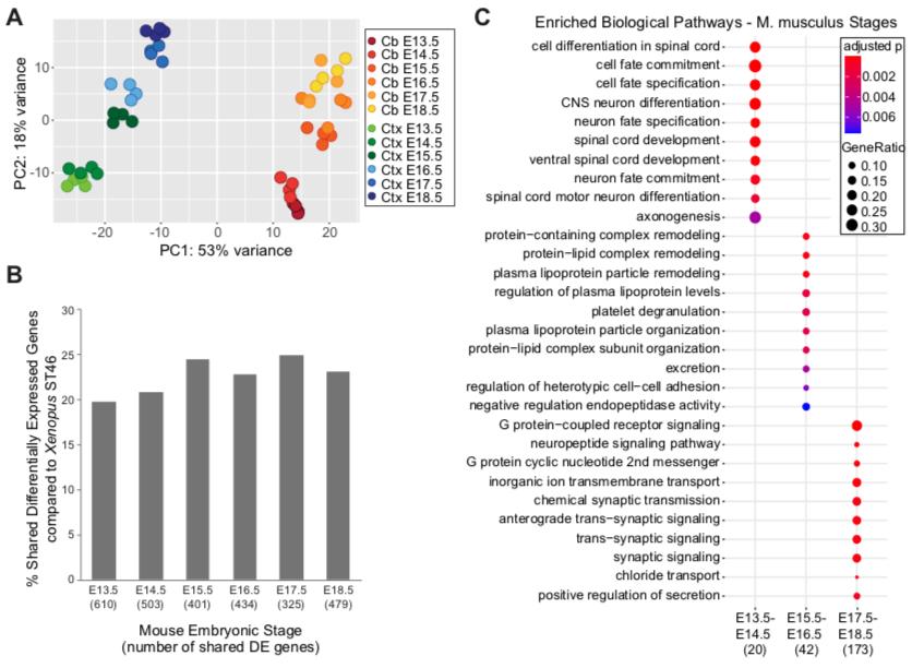 Figure 5. Expression analysis of mouse brain regions across development. A) Principal component analysis of mouse cerebral cortex (Ctx) and cerebellum (Cb) data, collected at timepoints E13.5-E18.5. B) Proportion of genes differentially expressed in the mouse cerebral cortex vs. cerebellum at each timepoint that was also differentially expressed in the tadpole stage 46 forebrain vs. hindbrain. The total number of differentially expressed genes in at this timepoint is indicated in parentheses next to the timepoint on the x-axis. All timepoints in the mouse model shared a similar proportion of genes with the tadpole timepoint. C) GO biological pathways enriched in the set of genes upregulated in both the mouse cerebral cortex and cerebellum at developmental timepoints from E13.5 to E18.5. Distinct pathways are upregulated at each developmental period. Dot size corresponds to the proportion of differentially expressed genes associated with the biological pathway, and dot color refers to the adjusted p-value. The numbers along the x-axis correspond to the total number of genes differentially expressed in each comparison.