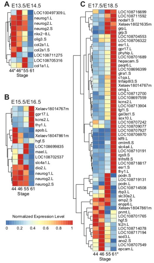 Figure 6. Comparison of gene expression between Xenopus and Mouse across development. A) Heat map showing expression of genes upregulated in the mouse cerebral cortex and cerebellum at E13.5/14.5 over the ST44-61 Xenopus midbrain. B) Heat map showing expression of genes upregulated in mouse cerebral cortex and cerebellum at E15.5/E16.5 over the ST44-61 Xenopus midbrain. C) Heat map showing expression of genes upregulated in the mouse cerebral cortex and cerebellum at E17.5/18.5 over the ST44-61 Xenopus midbrain. Genes are clustered by similarity in expression across Xenopus midbrain stages with complete linkage clustering, as indicated by the dendrograms to the left. E13.5/E14.5 genes were overrepresented in genes upregulated at Xenopus ST44 and ST46 (p<0.0001), while E17.5/E18.5 genes were overrepresented in genes upregulated at stage Xenopus ST61 (p<0.0001). Expression is normalized per-gene to the highest expression for gene.