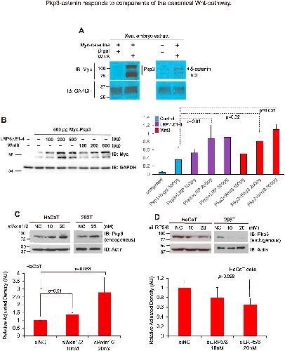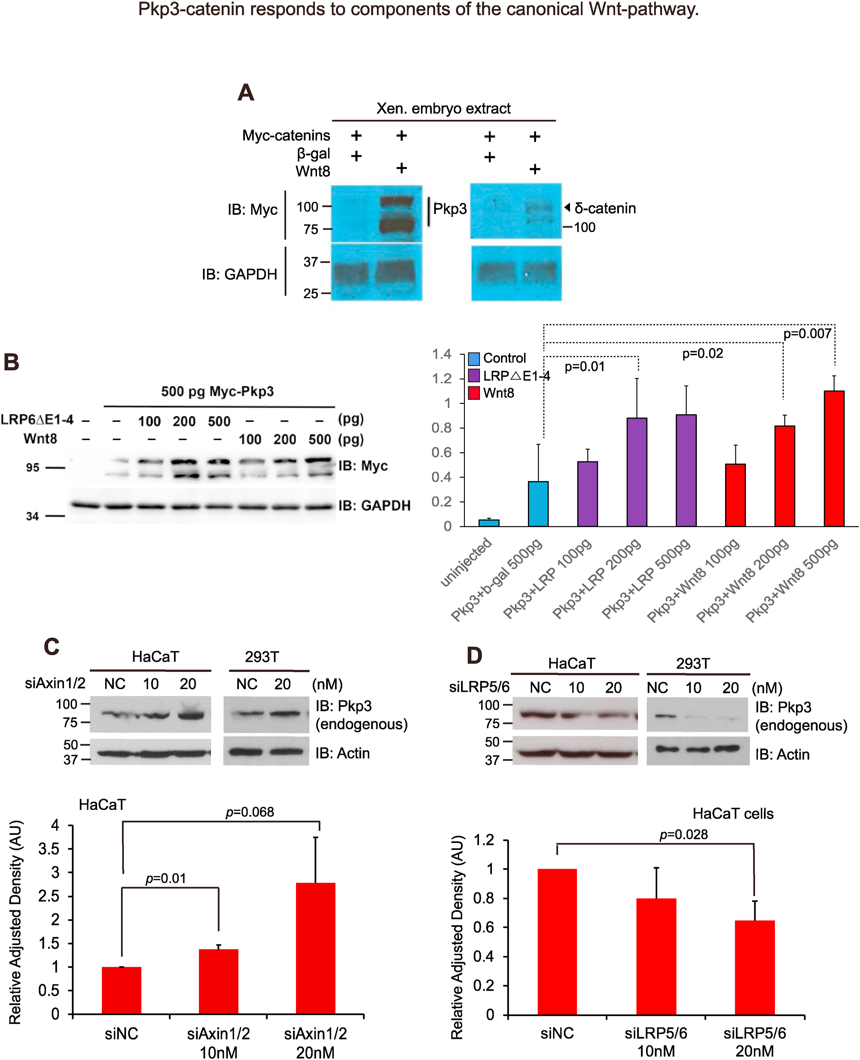 Fig. 1. Pkp3-catenin responds to components of the canonical-Wnt pathway. (A) In vitro transcribed mRNA encoding Myc-tagged Pkp3-catenin (1 ng) or Myc-tagged δ-catenin (1 ng) microinjected with mRNAs encoding Wnt8 (1 ng) or β-gal (1 ng; negative control) into one-cell stage embryos. Gastrulating embryos (stages 10â11) were harvested followed by immuno-blotting of their lysates. Catenin-protein detection occurred using anti-Myc antibodies, with GAPDH serving as an internal loading control. (B) Myc-pkp3 mRNA (500 pg) was microinjected into each blastomere of one-cell stage embryos with the indicated mRNA levels of wnt8, LRP6â³E1-4 or β -gal (500 pg; negative control) varying from 100 to 500 pg. Statistical significance was found when comparing β-gal (lane 2) to LRP6â³E1-4 at 200 pg p = 0.01 (lane 4), and wnt8 at both 200 pg p = 0.02 (lane 7), and 500 pg p = 0.007 (lane 8). GAPDH was used as a loading control. Bars along the sides of immuno-blots refers to the observed SDS-PAGE mobility of the corresponding molecular-weight standards. Statistical significance was established using a two-tailed T-test. Myc-Pkp3 and GAPDH were visualized using antibodies directed against Myc or GAPDH. (C) HaCaT and 293T cells were seeded in six-well plates, followed by the combined siRNA mediated depletion of Axin1 and Axin2. NC denotes negative-control siRNA. Endogenous Pkp3 was monitored using the 23E3/4 monoclonal antibody. Lower panel: employing densitometry and ImageJ software, endogenous Pkp3 levels were quantitated and normalized relative to Actin loading control. (D) HaCaT and 293T cells were transfected (48 h) with siRNAs [15] to deplete LRP5 and LRP6. Endogenous Pkp3 was monitored using the 23E3/4 monoclonal antibody. Lower panel: using densitometry and ImageJ software, endogenous Pkp3 levels were quantitated and normalized to the actin loading control. Experiments were repeated at least three times with consistent results.
