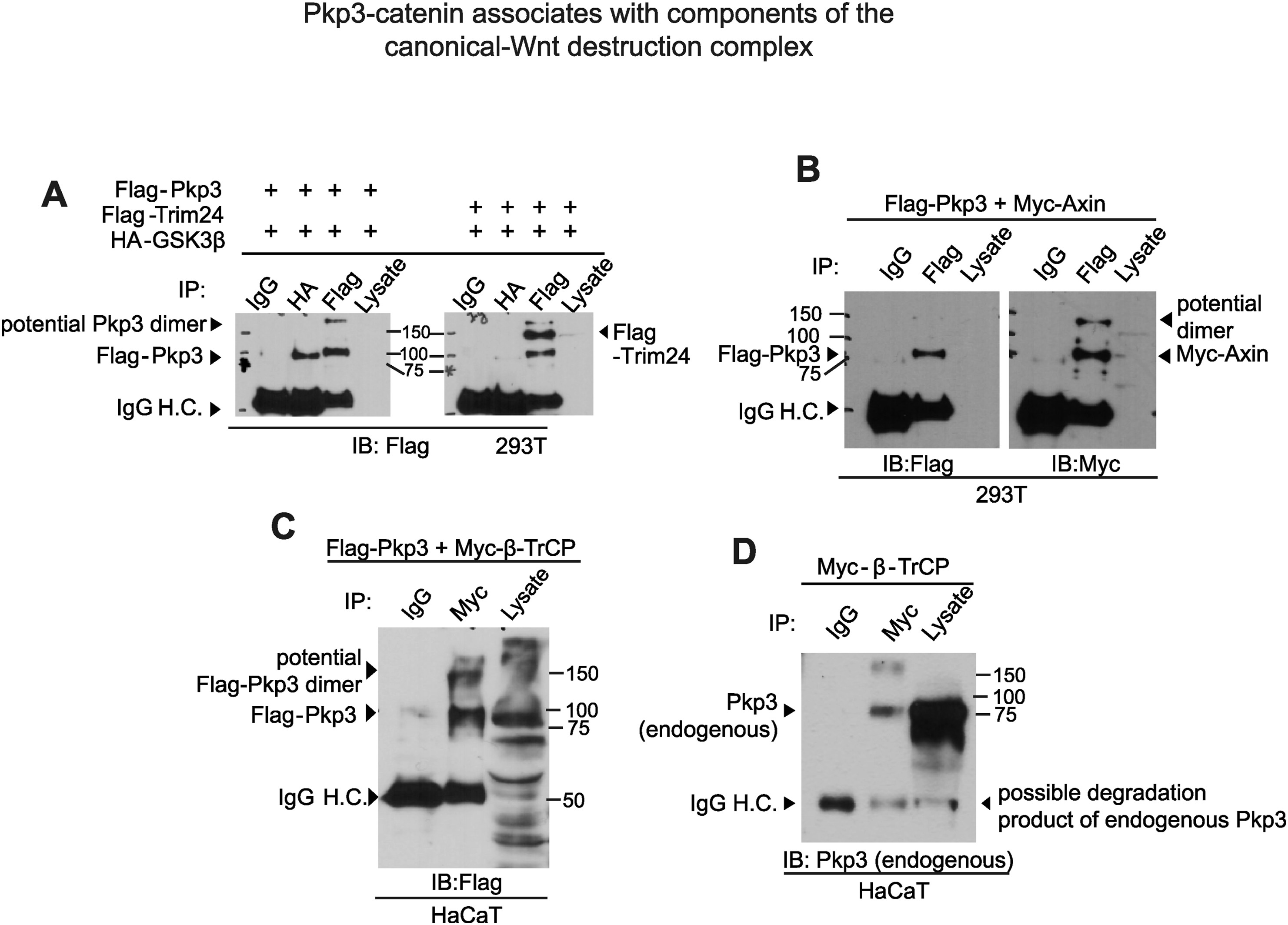 Fig. 3. Pkp3-catenin associates with components of the canonical-Wnt destruction complex. (A) 293T cells in 100 mm dishes were transfected with Flag-Pkp3 (8 μg) and HA-GSK3beta (5 μg). The Pkp3:GSK3β association was resolved via anti-HA or anti-Flag immuno-precipitation/immuno-blot. (B) Flag-Pkp3 (2 μg) and Myc-Axin (2 μg) were co-transfected in 293T cells. Immuno-precipitates (IP) of Flag-Pkp3 were immuno-blotted [19] with anti-Flag or -Myc antibodies to detect Pkp3 or Axin. (C) Flag-Pkp3 (3 μg) and Myc-β-TrCP (3 μg) were co-transfected into HaCaT cells. IPs were performed with anti-Myc antibody to precipitate β-TrCP, followed by immuno-blotting with anti-Flag antibody. (D) Endogenous Pkp3 co-precipitates with Myc-β-TrCP from HaCaT-cell extracts.