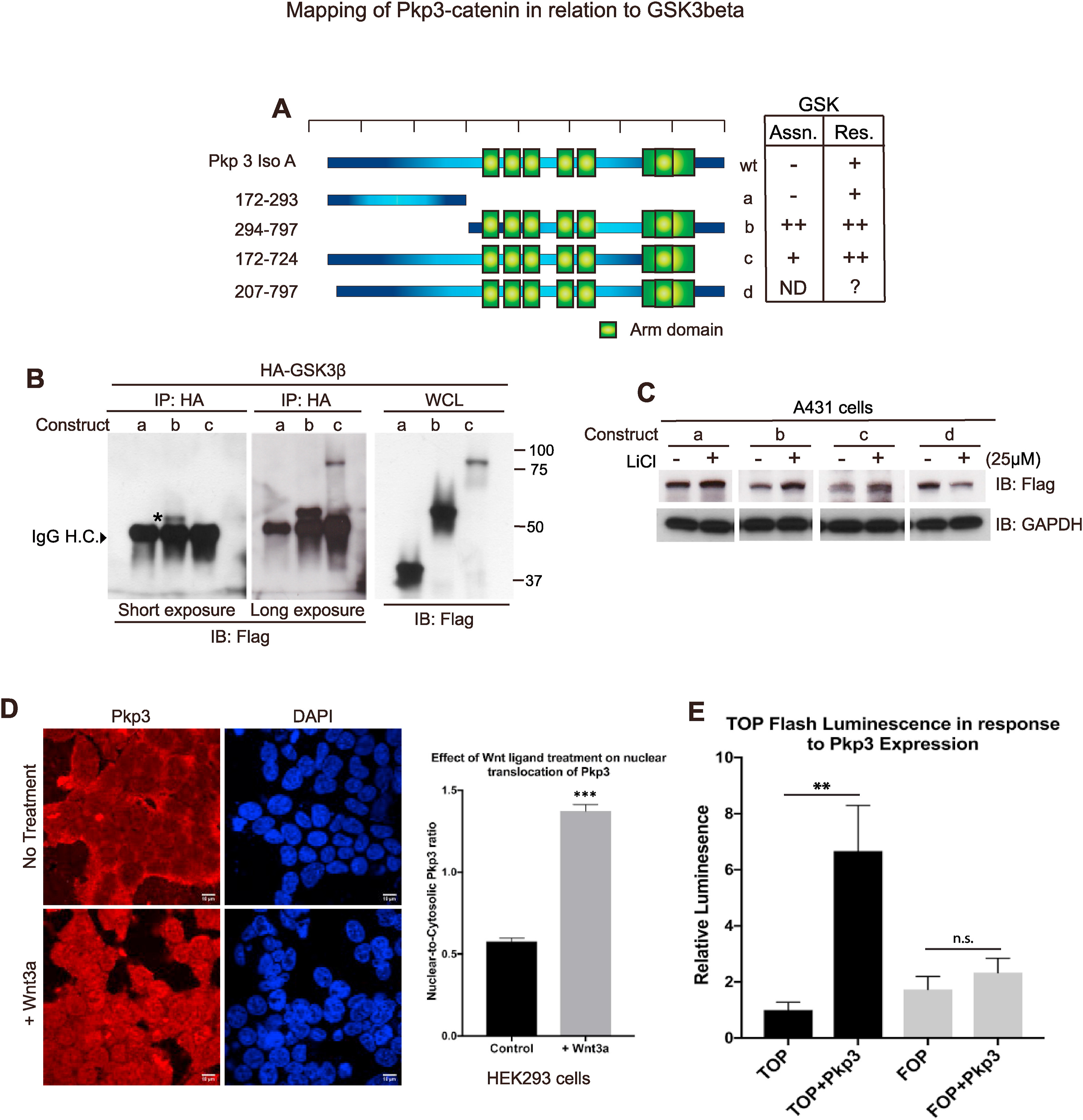 Fig. 4. Mapping of Pkp3-catenin in relation to GSK3beta. (A) Cartoon depicting Flag-tagged deletion constructs of Pkp3-isoformA (aâd). The chart summarizes construct association with GSK3beta as well as response to GSK3beta based upon data from panels B and C and similar experiments. (B) Deletion constructs of Flag-tagged Pkp3-catenin were co-transfected with HA-GSK3β in HaCaT cells. Immuno-precipitation (IP) of HA-GSK3beta was followed by anti-Flag immuno-blotting to resolve co-associated Pkp3. (C) Flag-tagged Pkp3 constructs were expressed in A431 cells, and their response monitored upon treatment with lithium chloride. The SDS-PAGE mobilities for constructs (aâc) are shown in Panel B, while (d) not shown in Panel B, migrates at â¼65 kDa). (D) Nuclear localization of Flag-tagged Pkp3 in HEK293 cells following treatment with Wnt3a peptide (50 μg/ml) for 24 h. The nuclear:cytosolic ratio of Pkp3-catenin notably increased relative to that of untreated controls (1.373 ± 0.041 versus 0.5778 ± 0.020; n = 30 cells/condition; âââ = p < 0.0001). (E) Exogenous expression of Pkp3 increases activity of the TOP-/FOP-flash canonical-Wnt reporter system. Relative to controls, HEK293 cells expressing Flag-tagged Pkp3 produced a 6.67-fold (±1.62) increase in luciferase activity (p = 0.0006). Significance was determined using a One-way ANOVA. Error bars represent SEM.