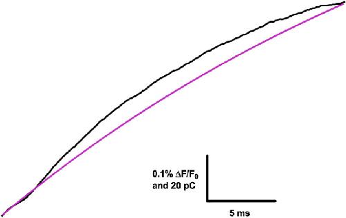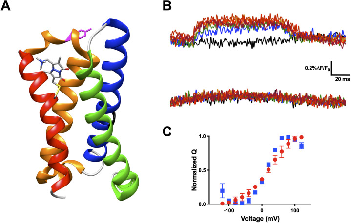 Figure 7—figure supplement 1. R1C-qBBr:W454A;F290W hyperpolarization-induced gating charge and fluorescence signal time course.Data are taken from a pulse from −120 to −160 mV. The integrated gating current of all four charges moving through the electric field (gating charge, Q, black) is more rapid than the hyperpolarization-induced fluorescence signal of R1C-qBBr:W454A;F290W, shown as the single exponential fit to the inverted fluorescence signal (purple). The fluorescence signal only follows the movement of the most extracellular gating charge (R1C-qBBr). Traces are aligned to each other, but the fluorescence signal is still slower than the gating charge. |