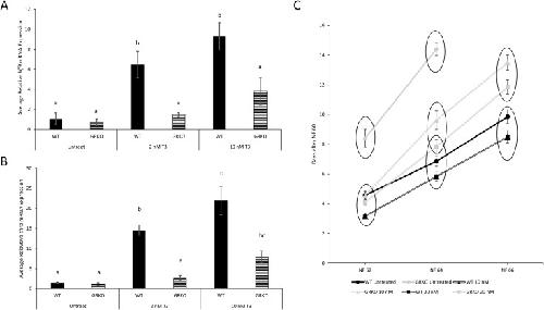 Fig. 1. GRKO tadpoles have reduced TH tissue responsivity and survive metamorphosis if provided T3. T3 induction levels of (A) klf9 and (B) thrb expression in tail are reduced in GRKO tadpoles. WT and GRKO tadpoles at NF 54 were treated for 24 h, and then tails were harvested to perform gene expression analysis, n = 5. (C) Exogenous T3 increased the rate of metamorphosis in GRKO and allowed them to survive through tail resorption. WT and GRKO tadpoles at NF 60 were treated daily with 10 nM and 20 nM T3, and days to NF 62, 64, and 66 were recorded. n = 6. Letters represent significance groups among all treatments within a panel, and circles represent significance groups within each treatment. Error bars represent standard error of the mean. WT = wild-type, GRKO = glucocorticoid receptor knockout, T3 = active form of TH. |