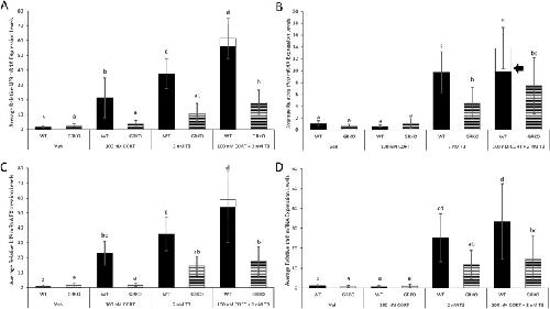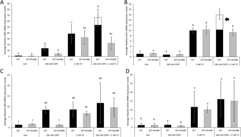 Fig. 3. Wild-type tadpoles treated with RU486 exhibit lack of CORT/TH synergy for thrb expression in tail. WT and RU486-treated tadpoles at NF 54 were treated with vehicle, 100 nM CORT, 2 nM T3, and 100 nM CORT plus 2 nM T3, and then gene expression was examined for (A) klf9 in tail, (B) thrb in tail, (C) klf9 in liver, and (D) thrb in liver. White portions of treatment bars for hormone co-treatments significantly higher than in T3 alone represent expression above additive response estimated from T3 and CORT responses singly. Black arrow indicates a synergistic response, defined as greater than one standard deviation above the estimated additive portion of the response. Error bars represent standard deviation (SD). Letters represent significance groups among all treatments within each panel. n = 8, WT = wild-type, GRKO = glucocorticoid receptor knockout, Veh = vehicle (ethanol treatment), CORT = corticosterone, T3 = active form of TH. |