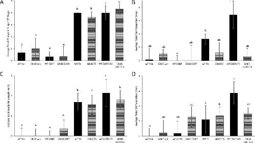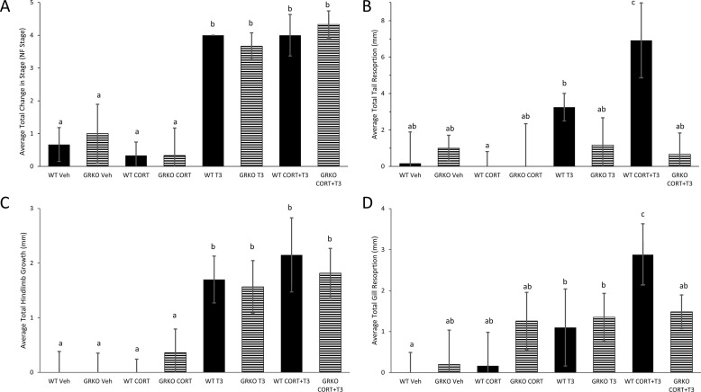 Fig. 5. GRKO tadpoles exhibit lack of CORT/TH synergy for tail and gill resorption. WT and GRKO were measured before and after treatment for 6 days with vehicle, 100 nM CORT, 2 nM T3, and 100 nM CORT plus 2 nM T3. Bars represent average total change from Day 0 to Day 6 in (A) NF stage, (B) tail length, (C) hindlimb length, and (D) gill width. Letters represent significance groups among all treatments within each panel. Error bars represent standard deviation. n = 5, WT = wild-type, GRKO = glucocorticoid receptor knockout, Veh = vehicle (ethanol treatment), CORT = corticosterone, T3 = active form of TH. |