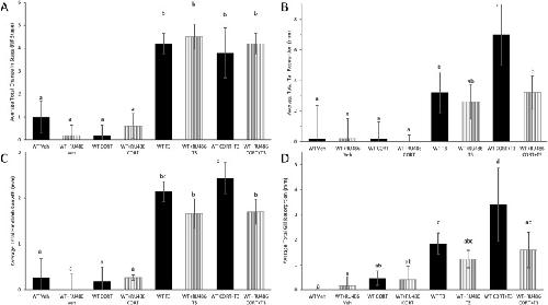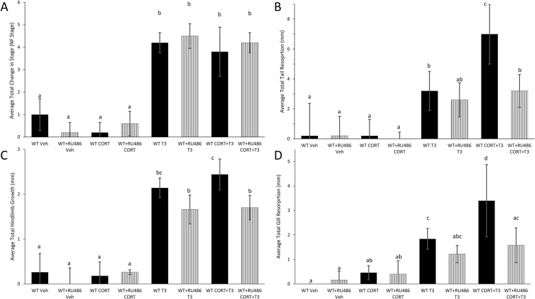 Fig. 7. WT tadpoles treated with RU486 exhibit lack of CORT/TH synergy for tail and gill resorption. WT and RU486-treated tadpoles were measured before and after treatment for 6 days with vehicle, 100 nM CORT, 2 nM T3, and 100 nM CORT plus 2 nM T3. Bars represent average total change from Day 0 to Day 6 in (A) NF stage, (B) tail length, (C) hindlimb length, and (D) gill width. Letters represent significance groups among all treatments within each panel. Error bars represent standard deviation. n = 5, WT = wild-type, RU486 = GR antagonist, CORT = corticosterone, T3 = active form of TH. |